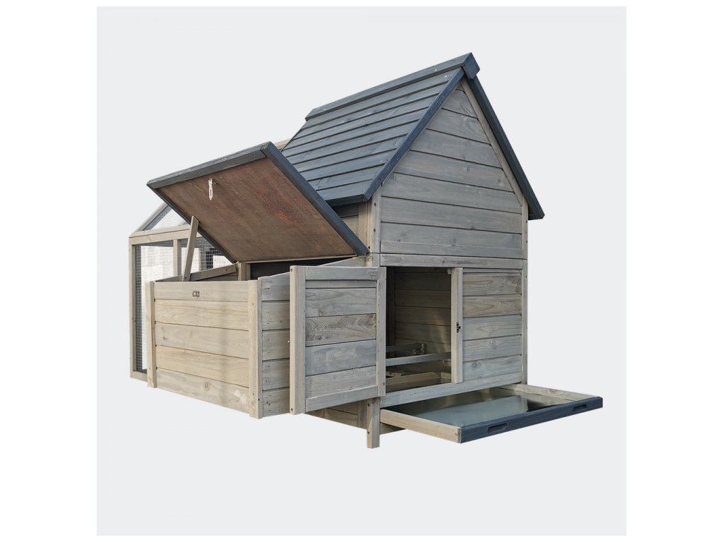 Pro snadný přístup je kurník vybaven hned dvěma dvířky. Jedny dvířka jsou umístěna z přední strany kurníku, druhý vstup je z boční strany s protiskluzní rampou. Samotný výběh je vybaven dvířky pro Váš snadný přístup pro výměnu krmení a vody. Čištění kurníku zvládnete hravě během chvilky díky výsuvnému trusníku. Také čištění snáškového hnízda nebude problém, díky výklopné stříšce.