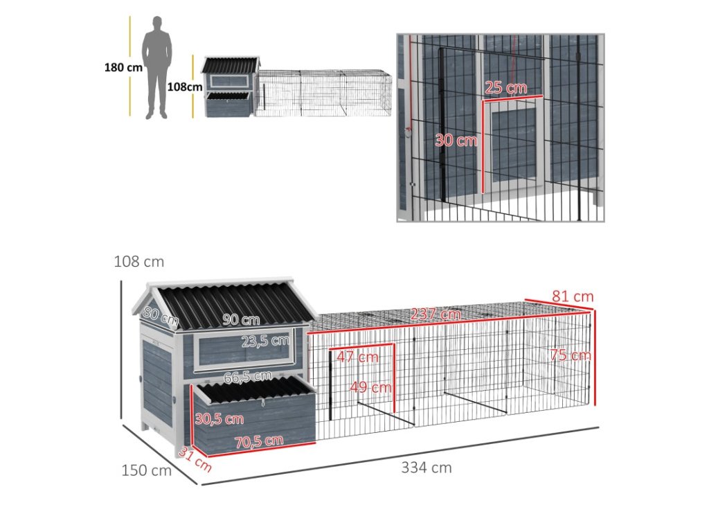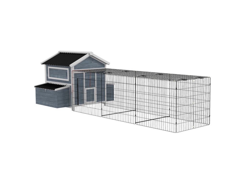 Specifikace kurníku: Celkové rozměry: 334 cm (délka) x 150 cm (šířka) x 108 cm (výška). Obytný prostor: 90 cm (délka) x 80 cm (šířka) x 98 cm (výška). Výběh: 237 cm (délka) x 81 cm (šířka) x 75 cm (výška). Vhodné pro 4-6 slepiček.