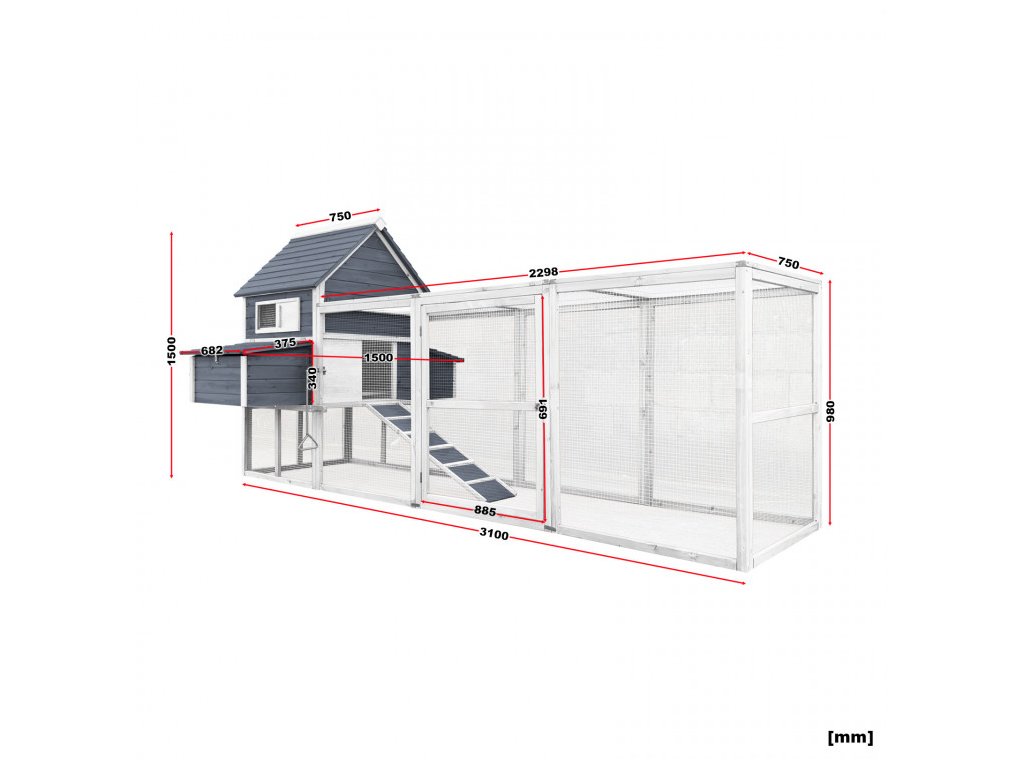 Rozměry kurníku jsou 3100x1500x1500 mm, a váha činí 39 kg. Produkt je dodáván ve