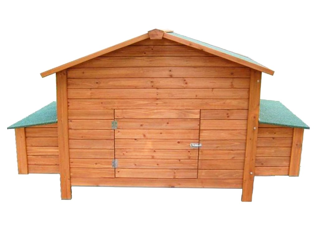 Kurník vyrobený z borovicového dřeva má hmotnost cca 40 kg a zajišťuje tak velkou stabilitu. Pro efektivní odvětrávání podlahy je umístěn na čtyřech zvýšených nožkách. I přes absenci zateplení zůstávají nosnice pod střechou kurníku i v snáškových hnízdech chráněny asfaltovou krytinou, což představuje opatření proti slunečnímu záření. Nicméně doporučujeme umístit kurník pod nějaký druh přístřešku, aby byl uchráněn před nepříznivými vlivy počasí, včetně deště, sněhu a slunečního záření. Dřevěný kurník je povrchově ošetřen základním ochranným nátěrem. Pro delší životnost je třeba, jako u každého dřeva, ochranný nátěr obnovovat. Cirkulaci vzduchu v kurníku zajišťuje přední vyklápěcí okénko.