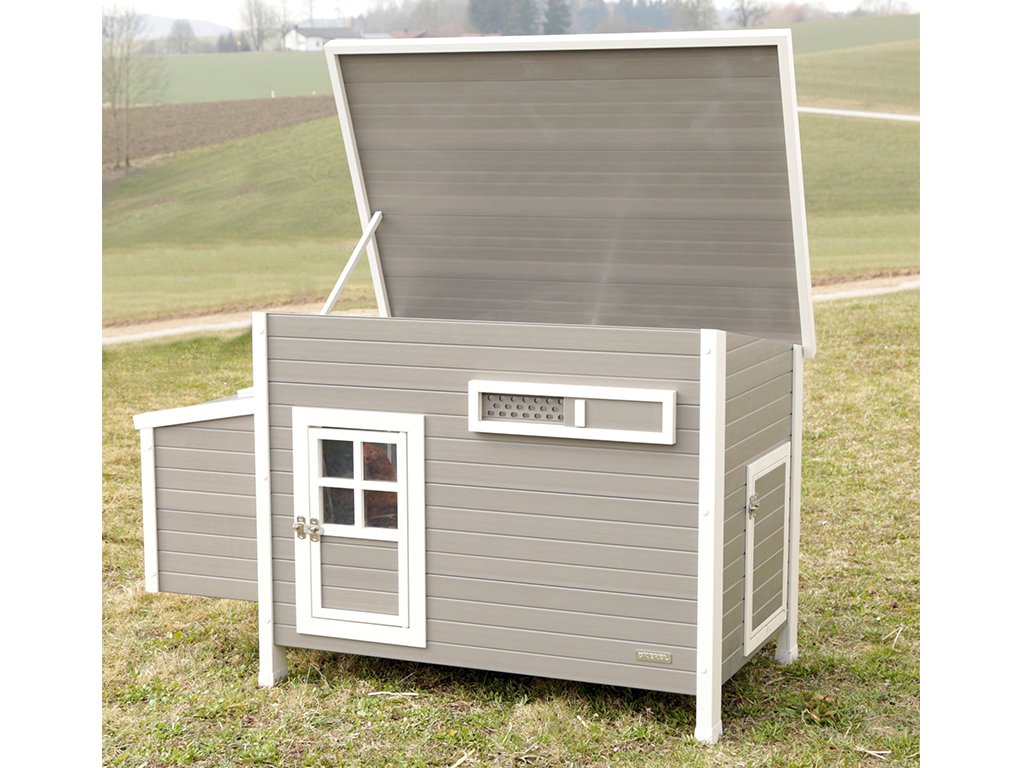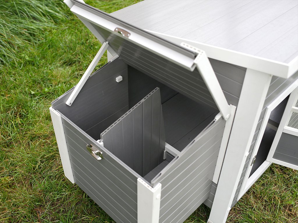 Kurník vyrobený z EKO plastu se velice snadno udržuje a čistí. Hladká struktura materiálu zajišťuje odolnost proti napadení různými parazity, roztoči, čmelíky. Čištění kurníku Vám usnadní otevíratelná střecha s jistícím mechanismem.