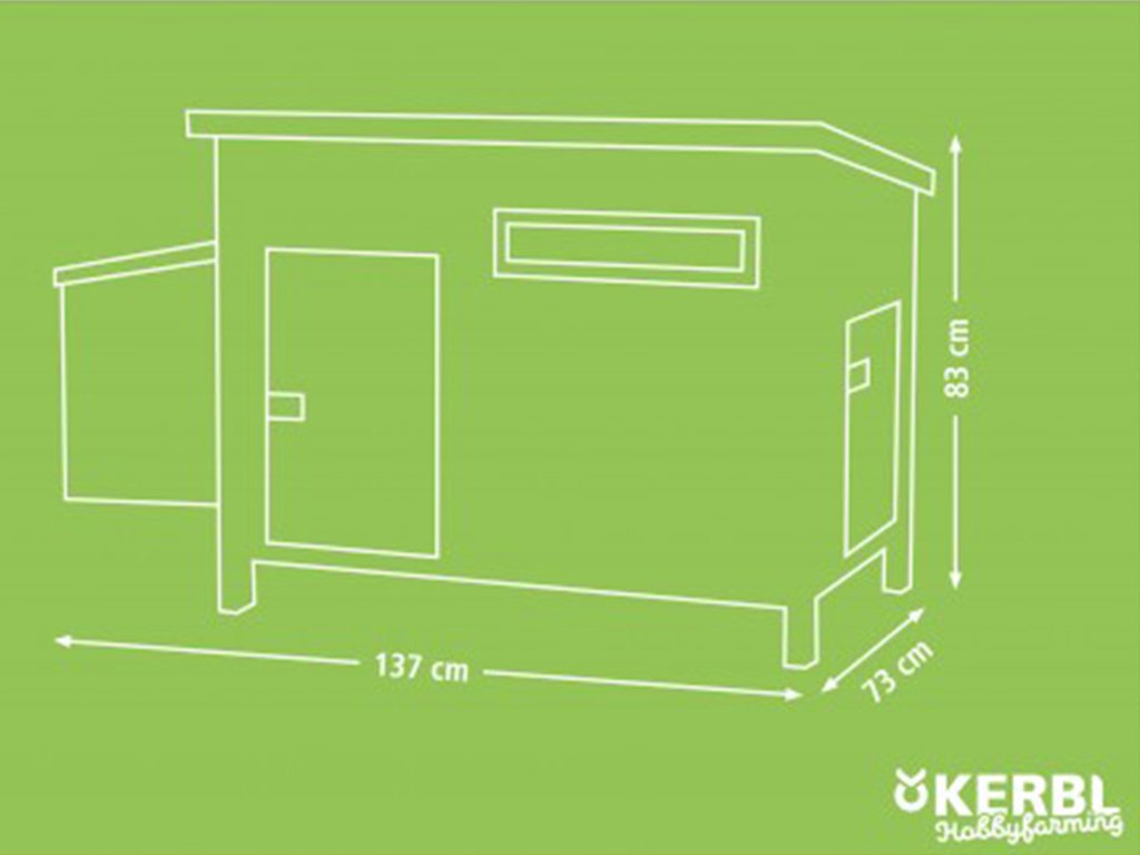 Vnější rozměry celého kurníku jsou 137 x 73 x 83 cm, a tak poskytuje pohodlí až pro 6 klasických nosnic. Rozměr předních dvířek: 41 x 23 cm, bočních dvířek: 34 x 26 cm (v x š).