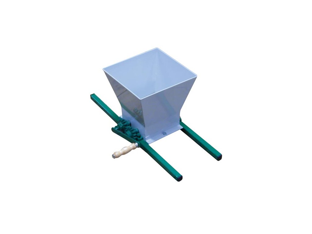 Ruční drtič na ovoce a zeleninu k přípravě směsi pro lisování. Drcení probíhá pomocí protiběžných válců s hřeby. Tento typ konstrukce přetvoří jablka na drobné částice s hřeby. Tato hmota je pak velmi vhodná k dalšímu lisování. Ocelový rám obsahuje plechovou násypku se dvěma silonovými válci s hřeby. Ovoce z násypky se na nich zachytává a drtí.