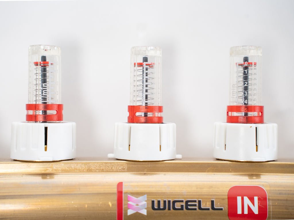 Slouží k nastavení průtoku topné vody v l/min a tím k vyregulování tlakových diferencích jednotlivých topných smyček. Podle směru otočení spodní části průtokoměru, snižujete nebo zvyšujete průtok topné vody nebo jej zcela uzavřete. Na průhledné části průtokoměru hladina vody zobrazuje průtok vody v l/min. Max. provozní tlak je 1 MPa.