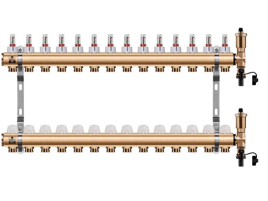 Podlahový rozdělovač WIGELL, 14 okruhů, mosazný + odvzdušňování na klíč