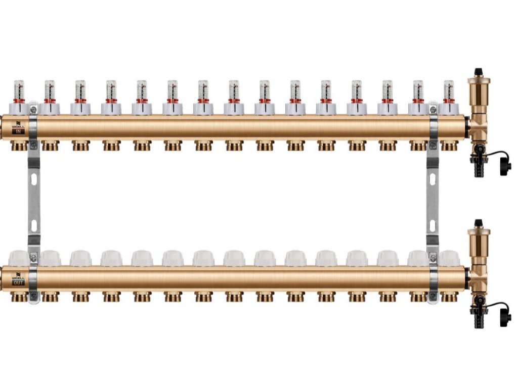 Podlahový rozdělovač WIGELL, 15 okruhů, mosazný + automatické odvzdušňování
