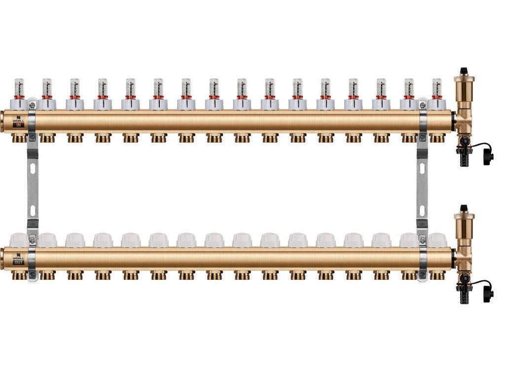 Podlahový rozdělovač WIGELL, 16 okruhů, mosazný + automatické odvzdušňování