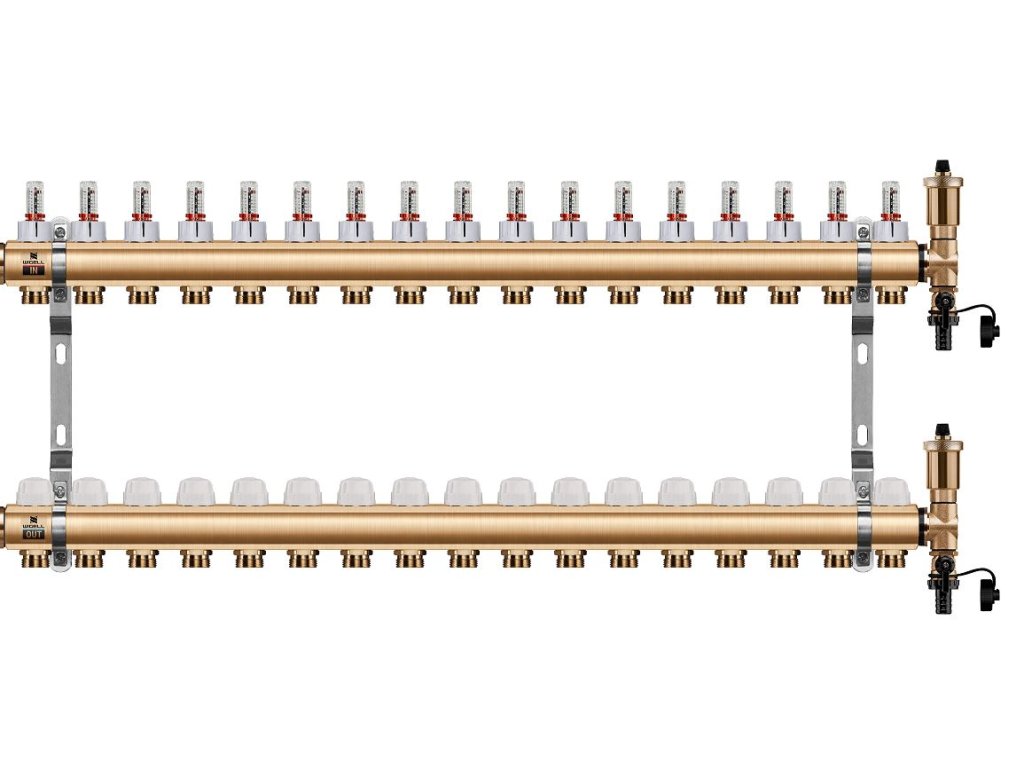 Podlahový rozdělovač WIGELL, 17 okruhů, mosazný + automatické odvzdušňování