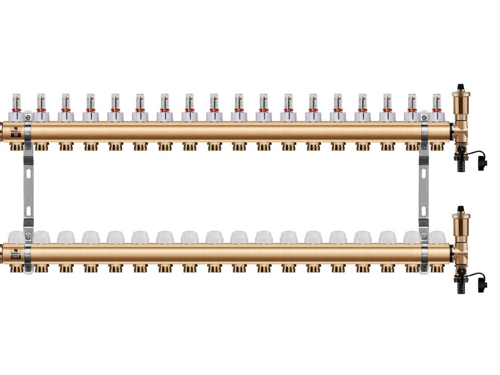Podlahový rozdělovač WIGELL, 18 okruhů, mosazný + automatické odvzdušňování