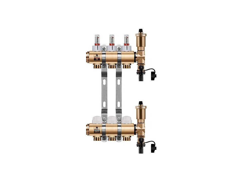 Podlahový rozdělovač WIGELL, 3 okruhy, mosazný + automatické odvzdušňování