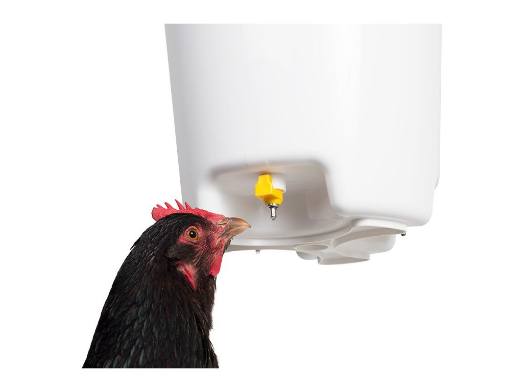Napájecí kbelík vhodný pro slepice, kachny a jinou drůbež. Zespodu kbelíku se nacházejí napájecí 3 niply, které spouští vodu v momentě stlačení zobákem. Hygienické a praktické! Vhodné pro zavěšení - včetně sady na zavěšení. Součástí niplů jsou filtry, které brání v ucpání niplů nečistotami.
