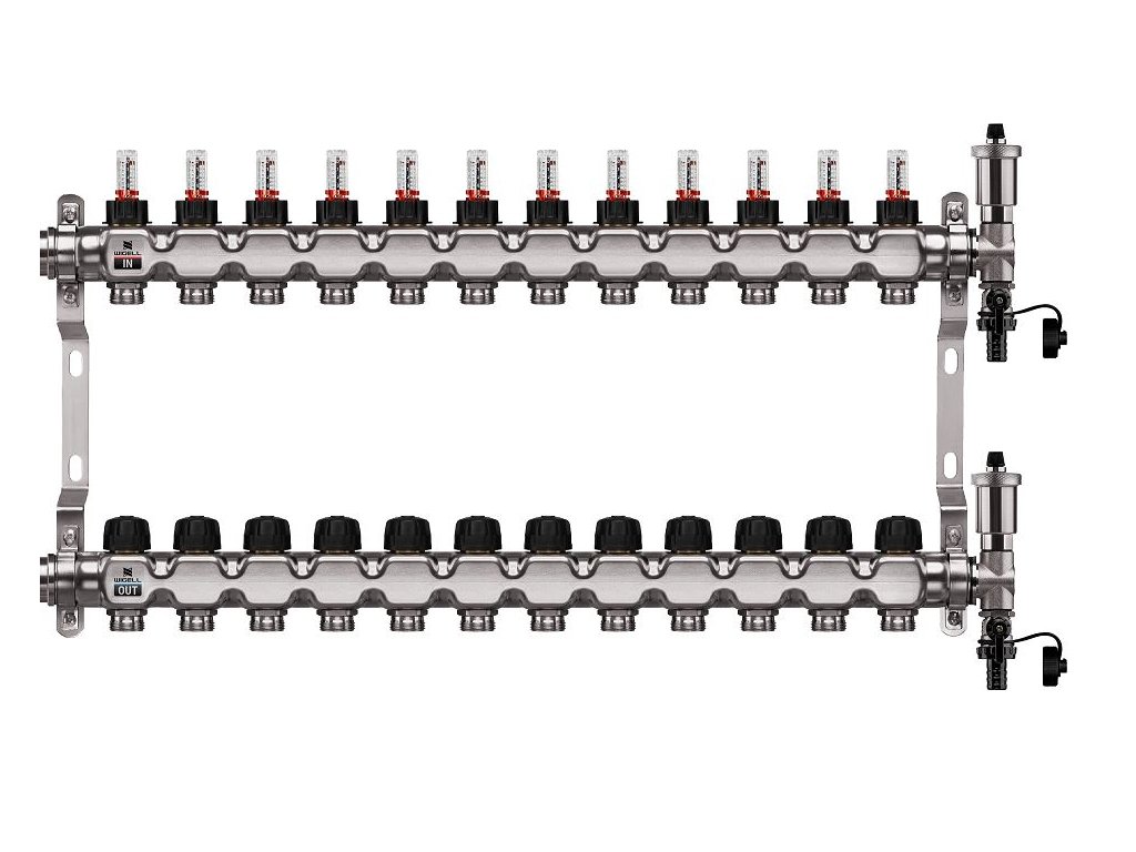 Podlahový rozdělovač WIGELL, 12 okruhů, nerez + automatické odvzdušňování