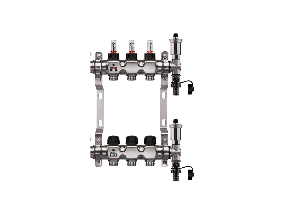 Podlahový rozdělovač WIGELL, 3 okruhy, nerez + automatické odvzdušňování