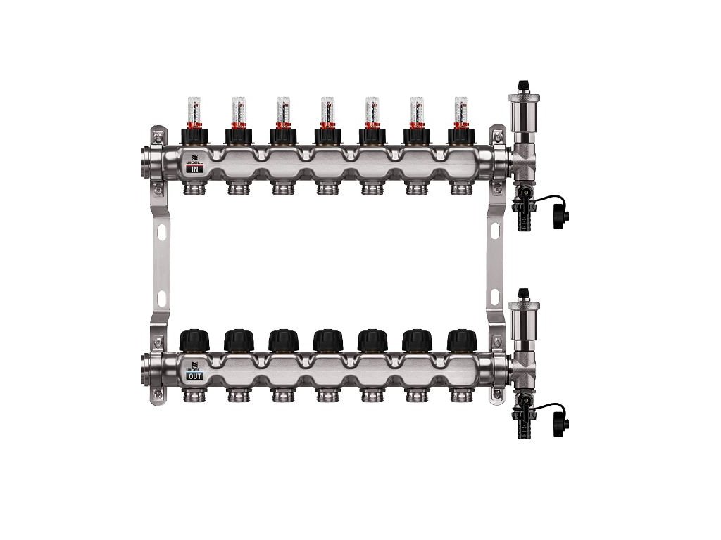 Podlahový rozdělovač WIGELL, 7 okruhů, nerez + automatické odvzdušňování