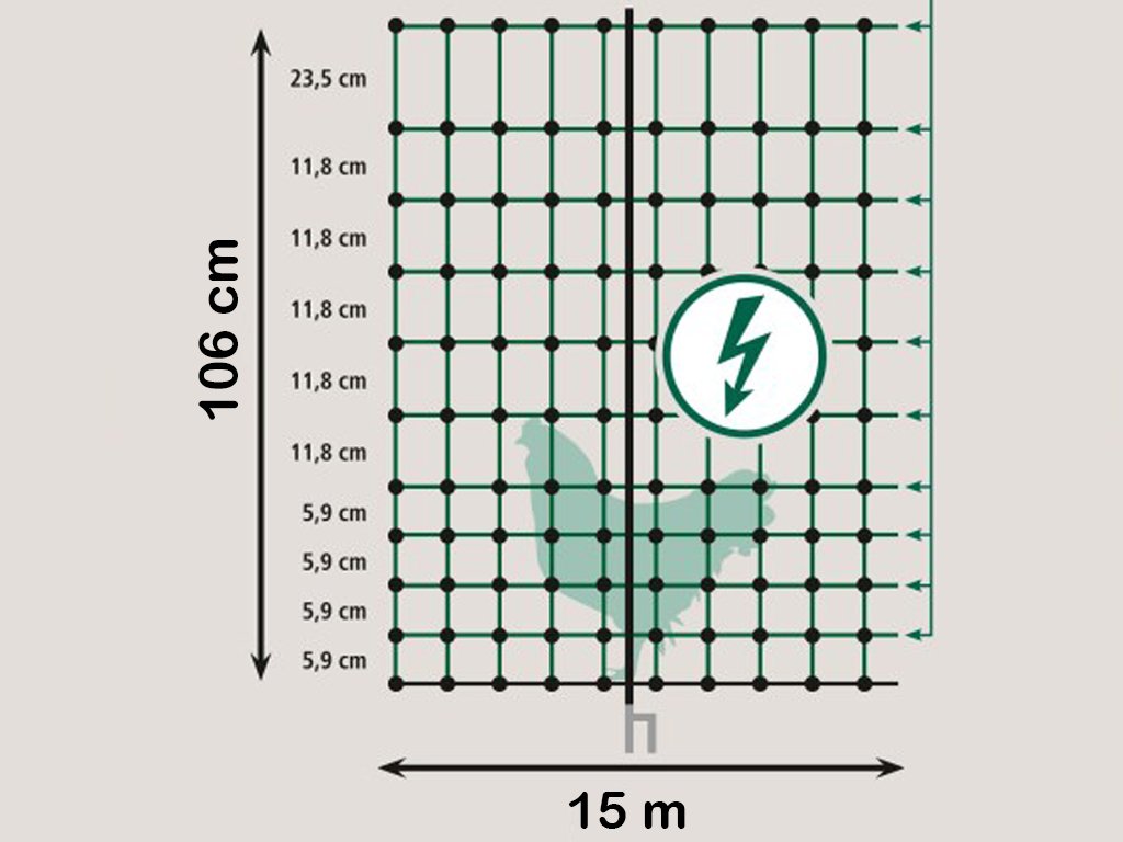 Ohradníková vodivá síť pro drůbež s výškou 106 cm a délkou 15 m, vhodná pro konstrukci elektrického ohradníku. Součástí balení je 6 pevných plastových tyček s dvojitým hrotem a 4 kotvící háky. Jedná se o ochrannou síť, která zamezí úniku slepic či jehňat a zároveň je ochrání před predátory.