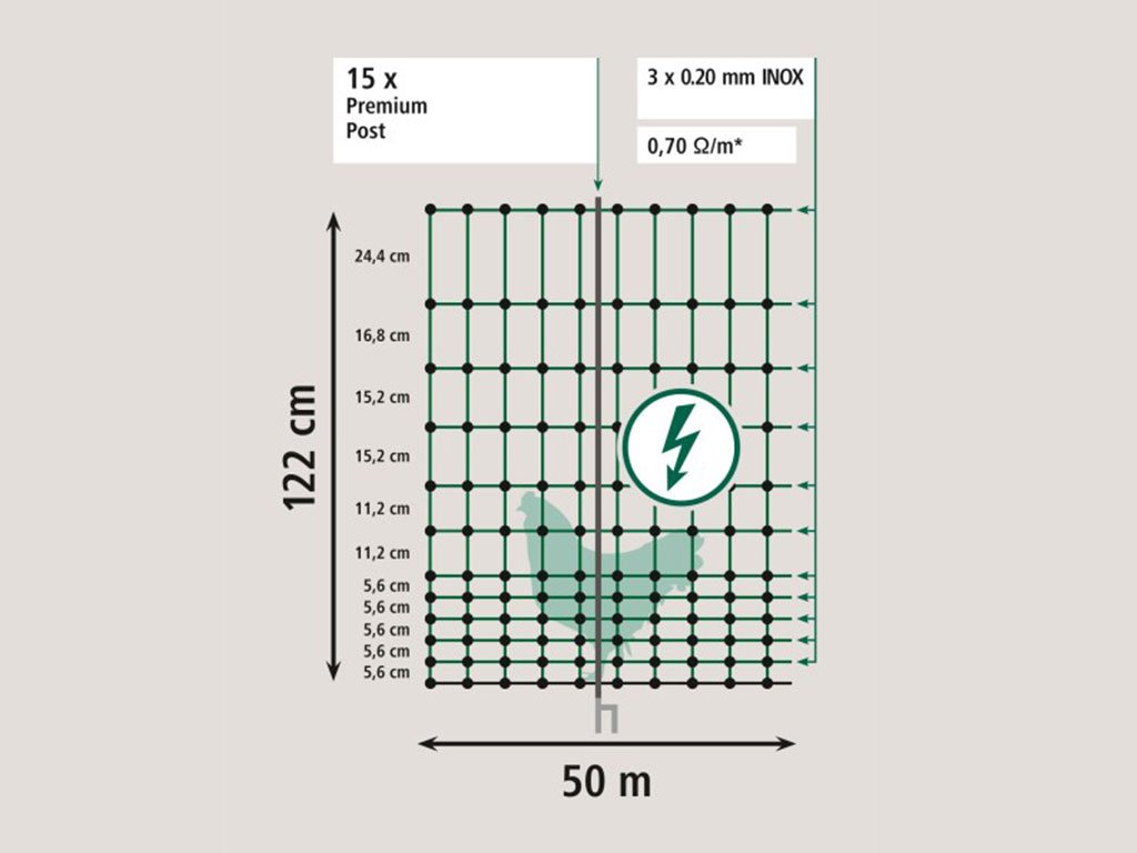 Ohradníková vodivá síť pro drůbež, pro konstrukci elektrického ohradníku, 15 PREMIUM sklolaminátových tyček, 4 kotvící háky, dvojitý hrot, menší velikost ok ve spodní části, výška 122 cm a délka 50 m.