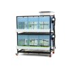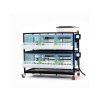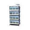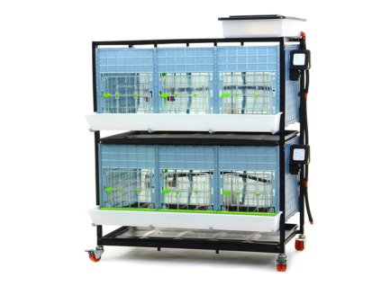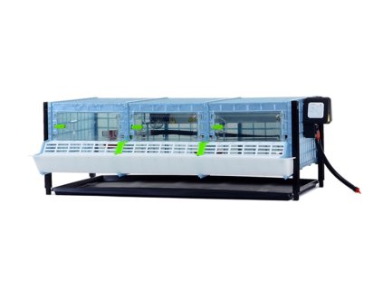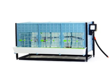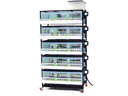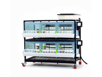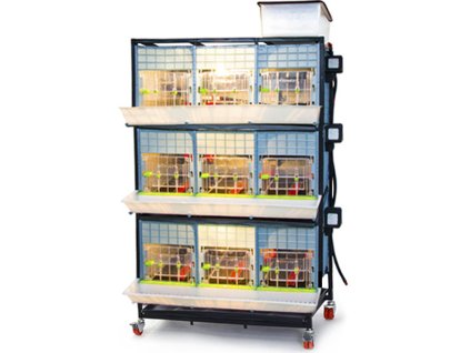 - Klece pro odchov s více patry a integrovaným krmením a napájením, vhodné pro větší množství mláďat.