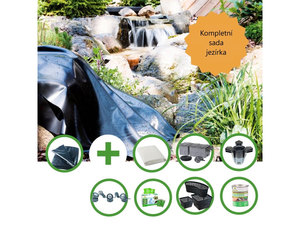 Sada pro výstavbu okrasného jezírka obsahuje jezírkovou fólii, ochranou jezírkovou geotextilii pod fólii, jezírkovou průtokovou filtraci dimenzovanou na chov ryb, včetně filtračních médií, bio domečky pro osídlení jezírkovými bakteriemi, filtrační houby pro hrubé nečistoty, regulovatelné čerpadlo s nízkou spotřebou, UV lampu proti tvorbě řas, hadicové přípojky na propojení čerpadla s filtrací a jezírkovou hadici. Dále roční sadu přípravku, obsahující úpravu vody, která reguluje tvrdost a ph vody, aby správně fungovali jezírkové bakterie odstraňující živiny z vody, druhá složka jsou právě jezírkové bakterie. Obsahuje 10 sáčků což stačí na pokrytí celé sezóny. Jezírkové osvětlení možné použít ve vodě i mimo, včetně výměnných barevných sklíček, pro změnu barvy osvětlení. Sázecí koše na vodní rostliny. Plovoucí hladinový skimmer s integrovaným čerpadlem, pro odstraňování nečistot z hladiny. Lepidlo na PVC fólie pro snadné spojení. Návod s návrhem na vybudování jezírka.