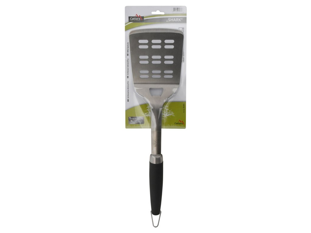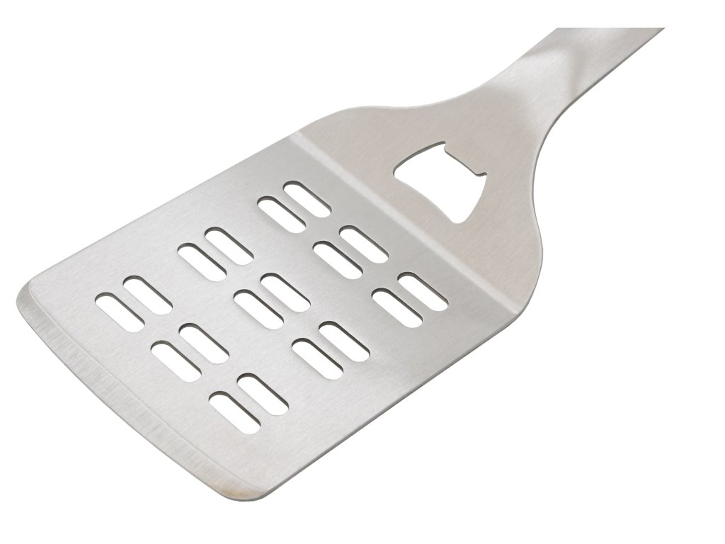 Zhotovení z kvalitní oceli s tloušťkou 1,8 mm. S rukojetí z teplotě odolného materiálu s ergonomickým tvarováním ve žraločí šedé barvě. Zakončení je opatřeno háčkem pro zavěšení. Nástroj má rozměry 45 x 10 x 4 cm a je opatřen perforovanou obracečkou 10 x 10 cm, doplněnou otvírákem na zátky. Tato obracečka najde uplatnění zejména doma při grilování, ale i v tábořišti, v kempu a jinde v přírodě.