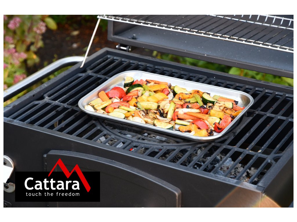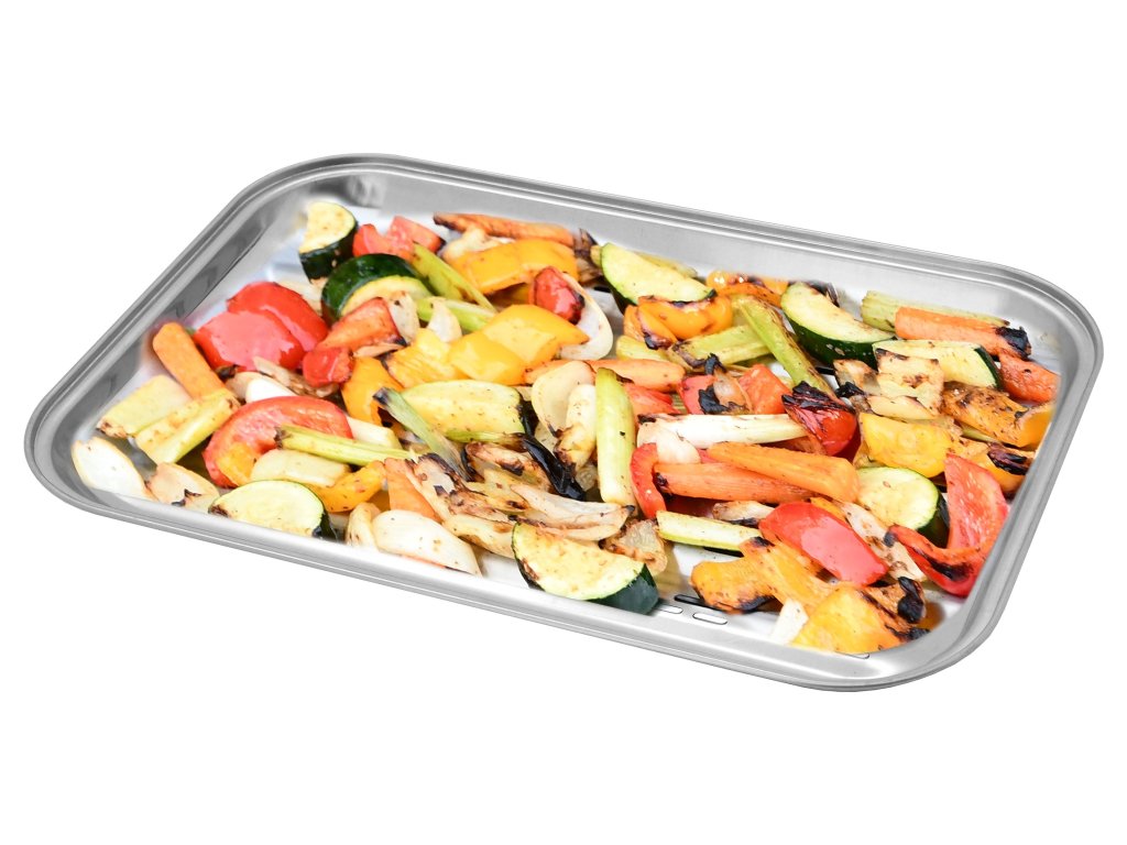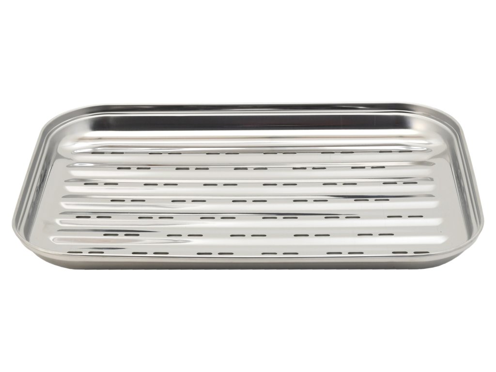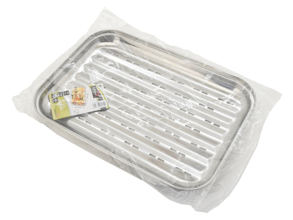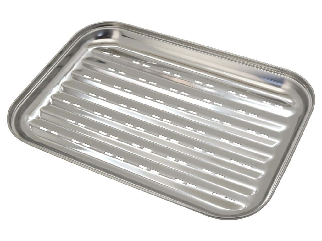 Předností je zpracování z kvalitní a silné nerezové oceli. Narozdíl od klasických aluminiových, je možné umytý ocelový tácek požívat stále dokola. Celkové rozměry tácku 34 x 24 cm zabezpečí grilování větších porcí.