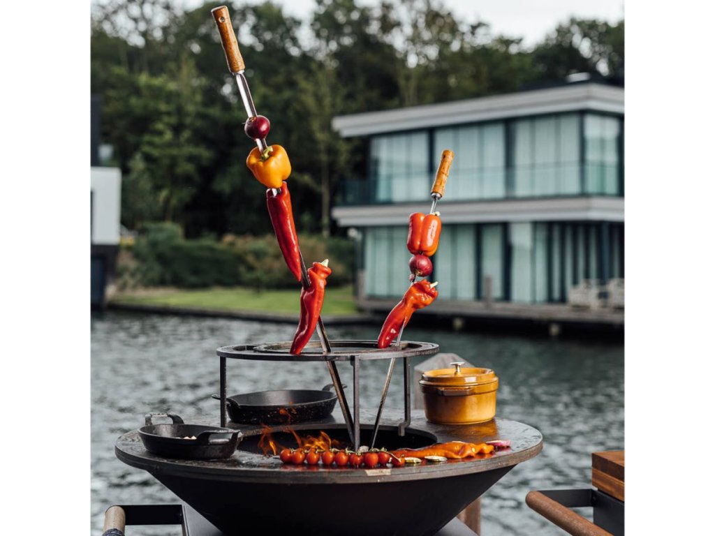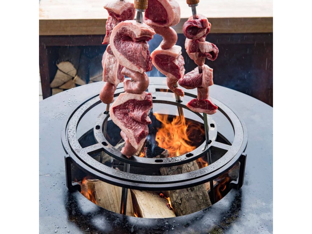 OFYR Brazilian Ring 100 je skvělým doplňkem k vašemu grilu OFYR 100, který vám umožňuje opékat maso v brazilském stylu. Tento kruh obsahuje zářezy pro vertikální umístění špízů, které umožňují pomalé a rozmanité opékání masa a dodává mu chuť díky jeho poloze přímo nad ohněm.