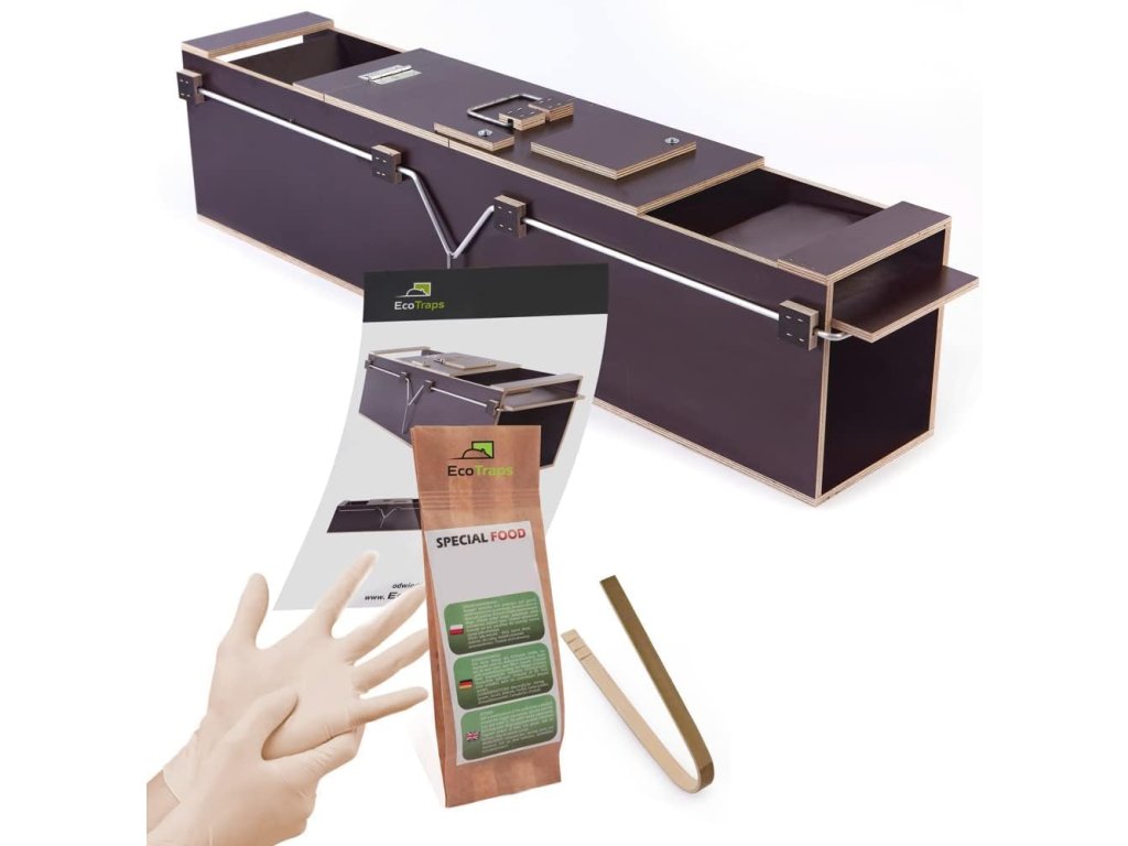 Středně velká dřevěná past se dvěma vstupy a nášlapným mechanismem typu most, určená pro efektivní a bezpečný odchyt drobných škůdců. Robustní konstrukce je vyrobena z 9mm březové překližky a vyztužena vnitřní pozinkovanou ocelovou sítí.
