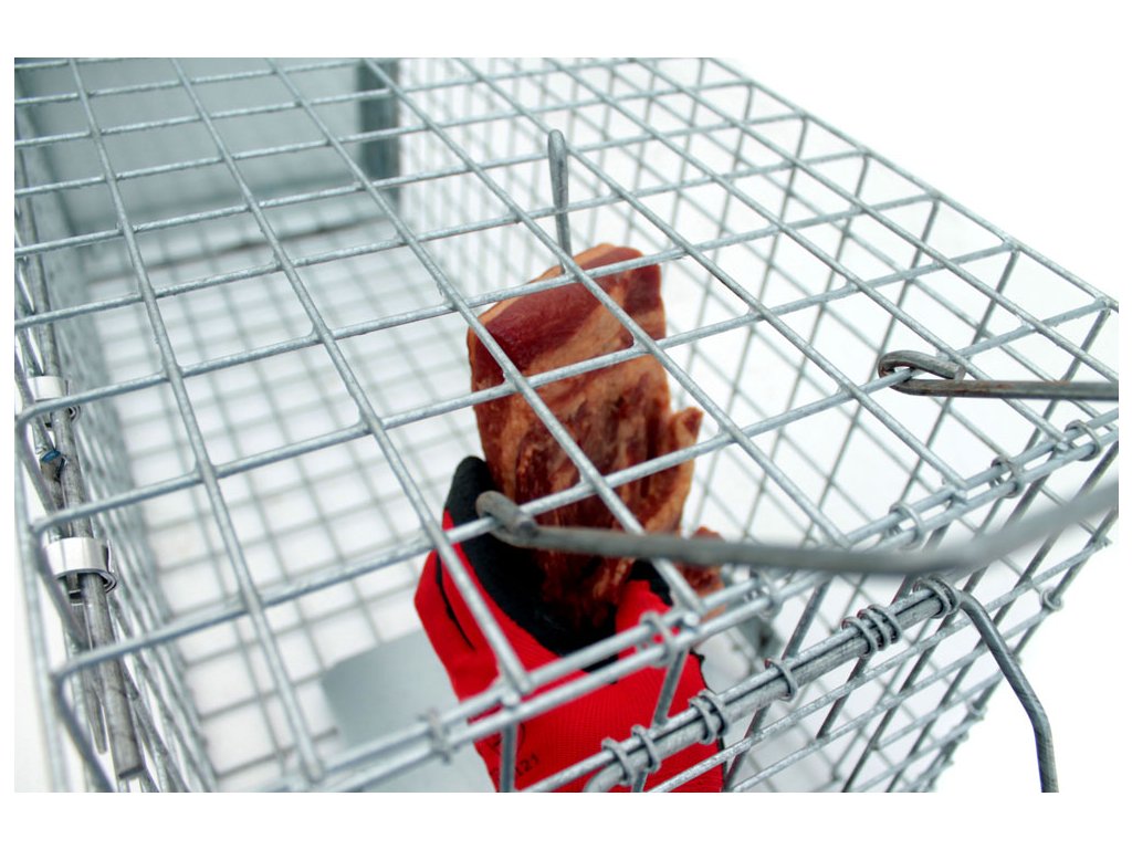 Návnada se umisťuje do zadní části pasti, tedy na opačný konec od vstupu. K pohodlnému a bezpečnému vložení návnady slouží robustní boční dvířka. Díky důmyslnému nášlapnému mechanismu lze nástrahu, například vejce nebo kousek masa, pevně zafixovat do připravených otvorů. To zvyšuje šanci na úspěšný odchyt – zvíře se při snaze o získání návnady aktivuje spouštěcí systém a past se uzavře.