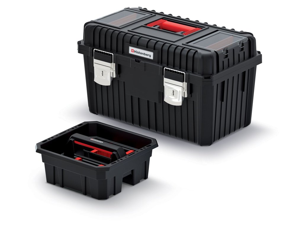 Plastový kufr na nářadí s vyjímatelným vkladem. Pro přehlednou organizaci šroubků, matek apod. disponuje kufr vnějšími přihrádkami. Kovové zámky. Černá barva.