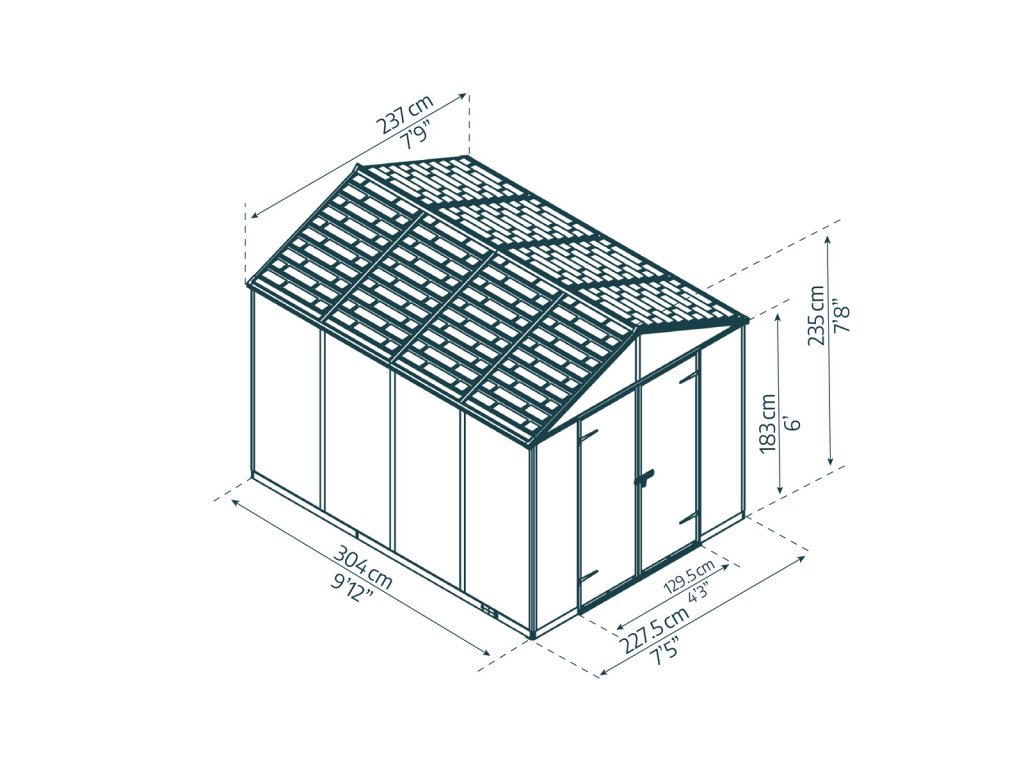 Domek Rubicon je vyroben ze zesíleného polykarbonátu s tloušťkou 10 mm, který je odolný vůči UV záření, mrazu, dešti, sněhu i kroupám. Konstrukce je zpevněna hliníkovým rámem, který nikdy nezrezaví. Dveře domku jsou široké 129 cm, uzamykatelné, s ocelovými panty a nízkým prahem, což zajišťuje pohodlný přístup. Domek je navíc vybaven protiskluzovou podlahou, která chrání uložené věci před vlhkostí. Dva integrované otvory zajišťují stálé odvětrávání.