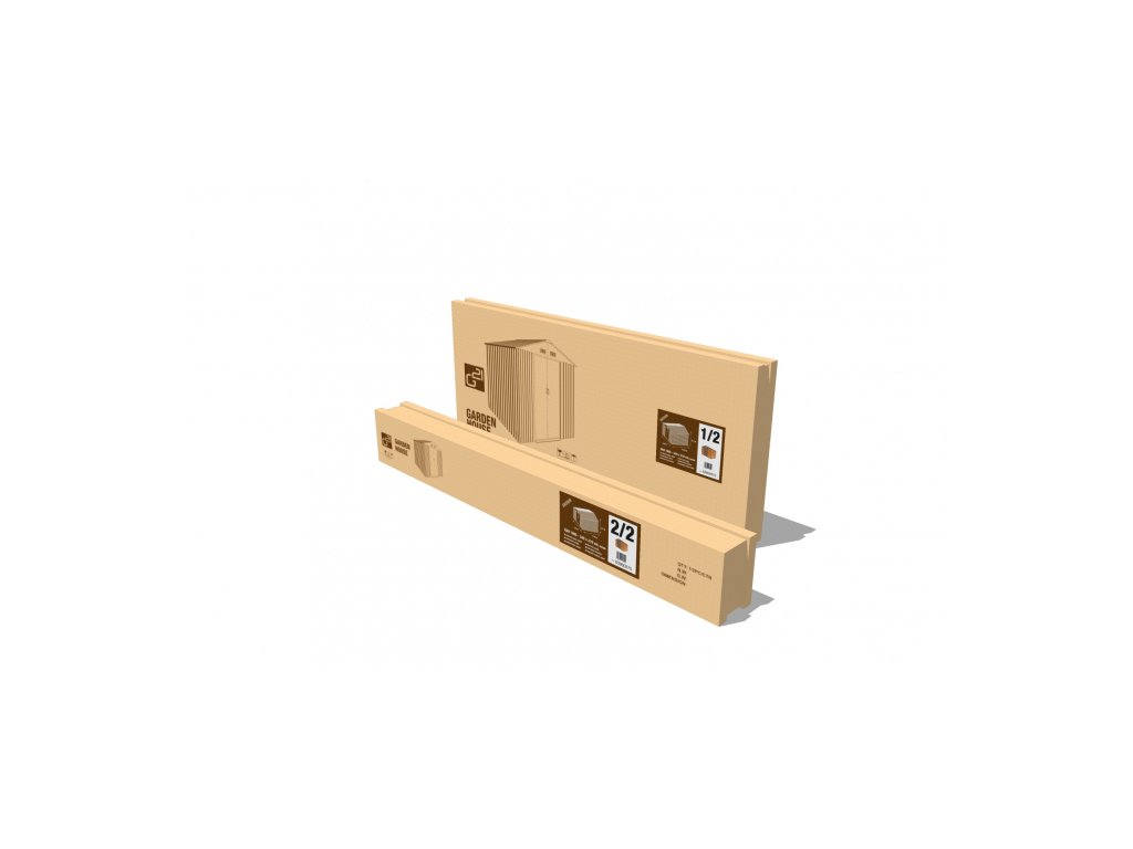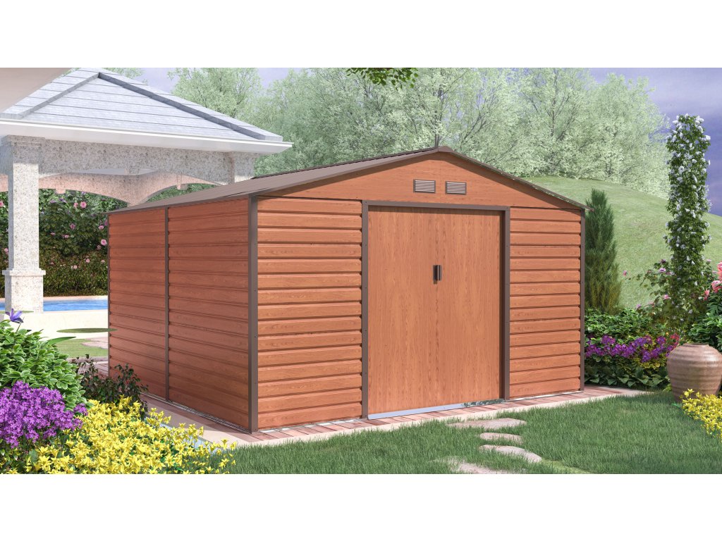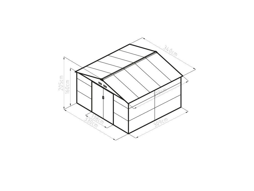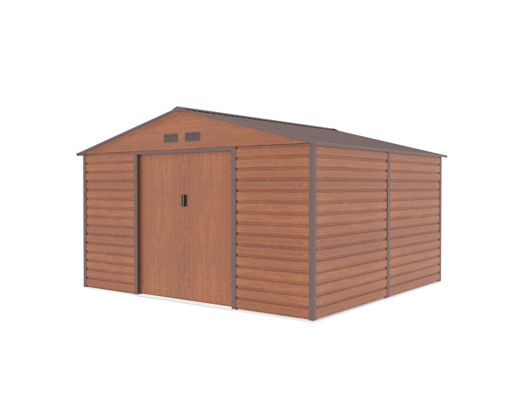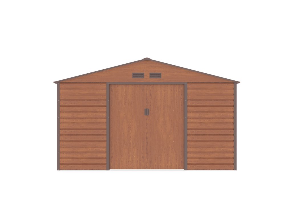 Konstrukci domku tvoří pevný pozinkovaný rám a ocelový pozinkovaný plech tloušťky 0,25–0,30 mm s práškovým nástřikem, který je odolný vůči špatnému počasí, konstrukce je vybavena větracími mřížkami. Tento model má sedlovou střechu a dvoukřídlé posuvné dveře o šířce 138 cm a výšce 160 cm. Střecha zahradního domku je bezpečná při maximálním zatížení sněhem do 90 kg/m2. Součástí balení jsou dveřní úchyty, díky kterým domek snadno zajistíte proti nezvaným hostům. Plechy zahradního domku jsou opatřeny kvalitním nástřikem v dekoru dřeva, proto se nemusíte bát, že plechový domek nenaruší přírodní ráz vaší zahrady.
