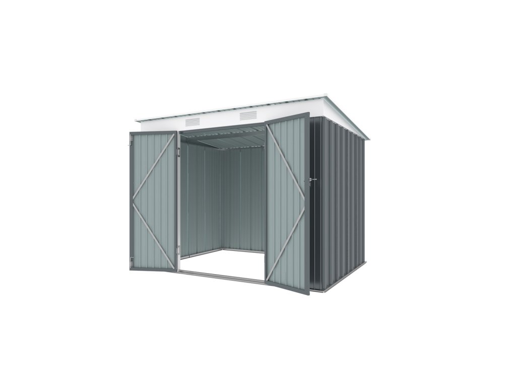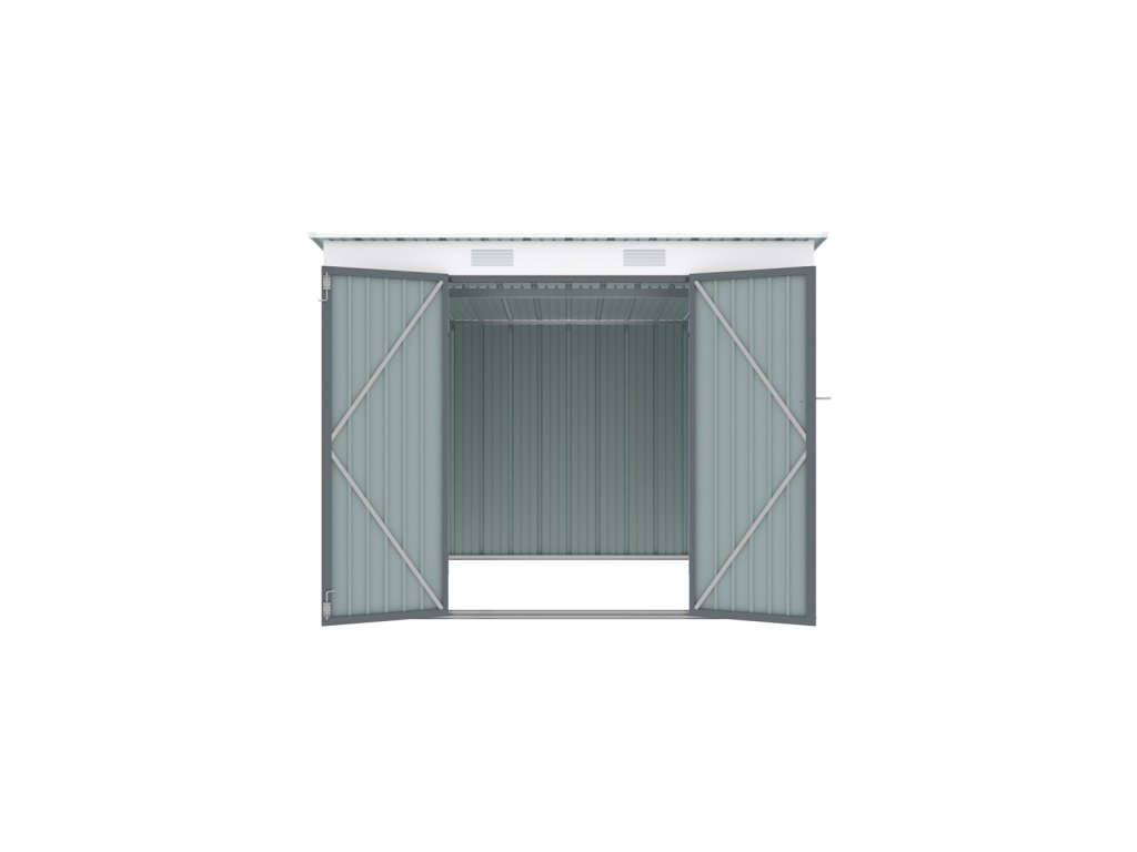 Domek RMSP je vyroben z žárově zinkovaného rámu a profilovaných ocelových plechů s kvalitním práškovým nátěrem. Tyto materiály zajišťují dlouhou životnost, odolnost vůči korozi a minimální nároky na údržbu. Vyztužená konstrukce střechy poskytuje domku vyšší odolnost vůči nepříznivým povětrnostním podmínkám, jako jsou vítr a sníh. Domek je vybaven širokými dvoudílnými křídlovými dveřmi s petlicí, které lze bezpečně uzamknout pomocí zámku, jenž je součástí balení. Dveře umožňují snadný přístup i manipulaci s většími předměty, jako jsou zahradní sekačky nebo nářadí.