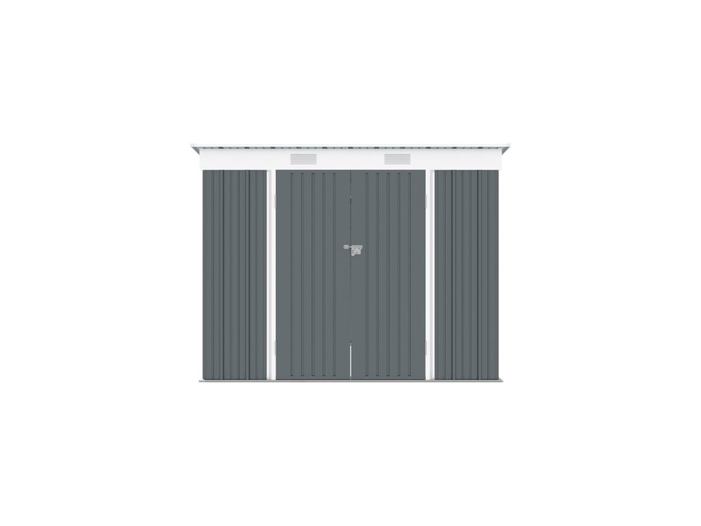 Pultová střecha domku je nejen estetická, ale také praktická – její sklon umožňuje efektivní odvod vody a sněhu, čímž minimalizuje zatížení konstrukce. Dva integrované větrací otvory zajišťují optimální cirkulaci vzduchu a chrání uložené předměty před vlhkostí a kondenzací.