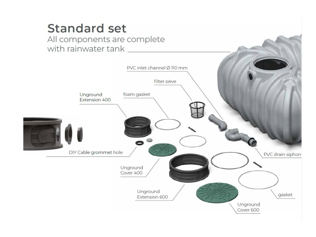 Nádrž na dešťovou vodu je možné rozšířit o další doplňkové příslušenství, jako například záchytné jímky, odvzdušňovací systém pro záchytné jímky, nebo spojovací trubky k propojení jímek a nádrže, které pohodlně zakoupíte v našem e-shopu.
