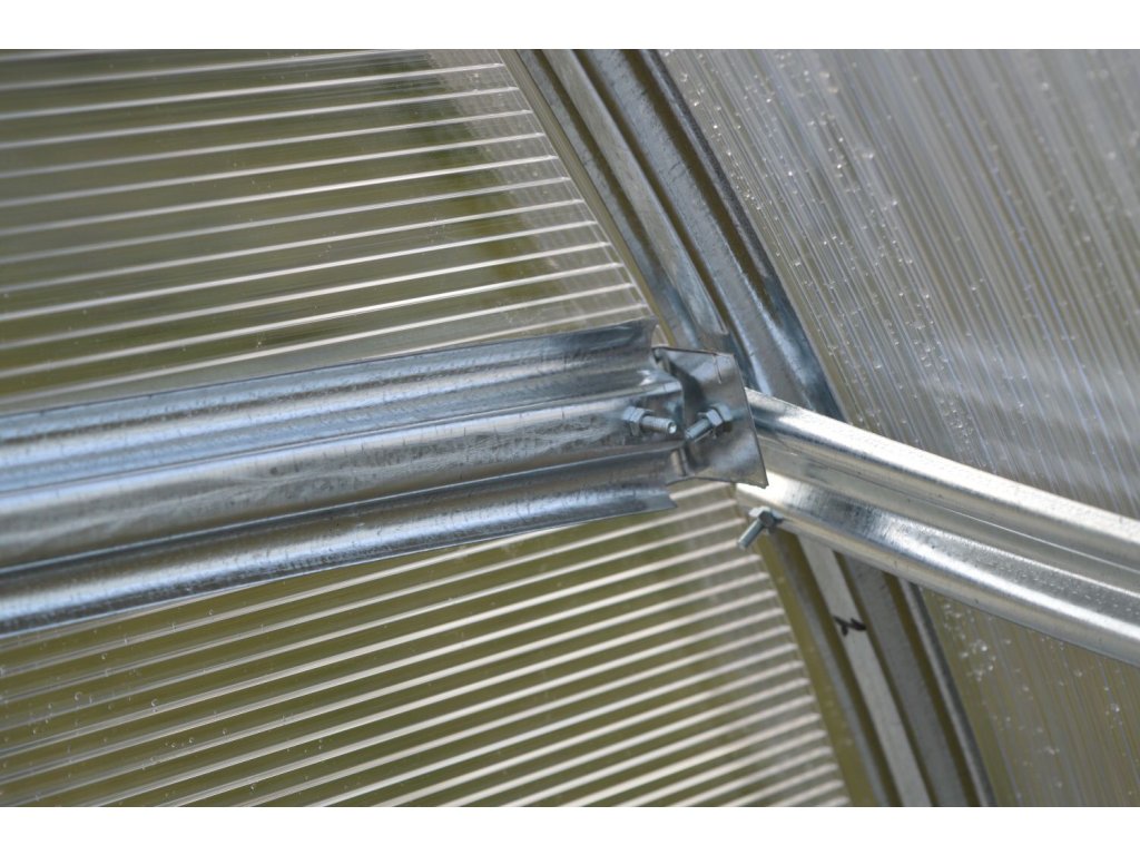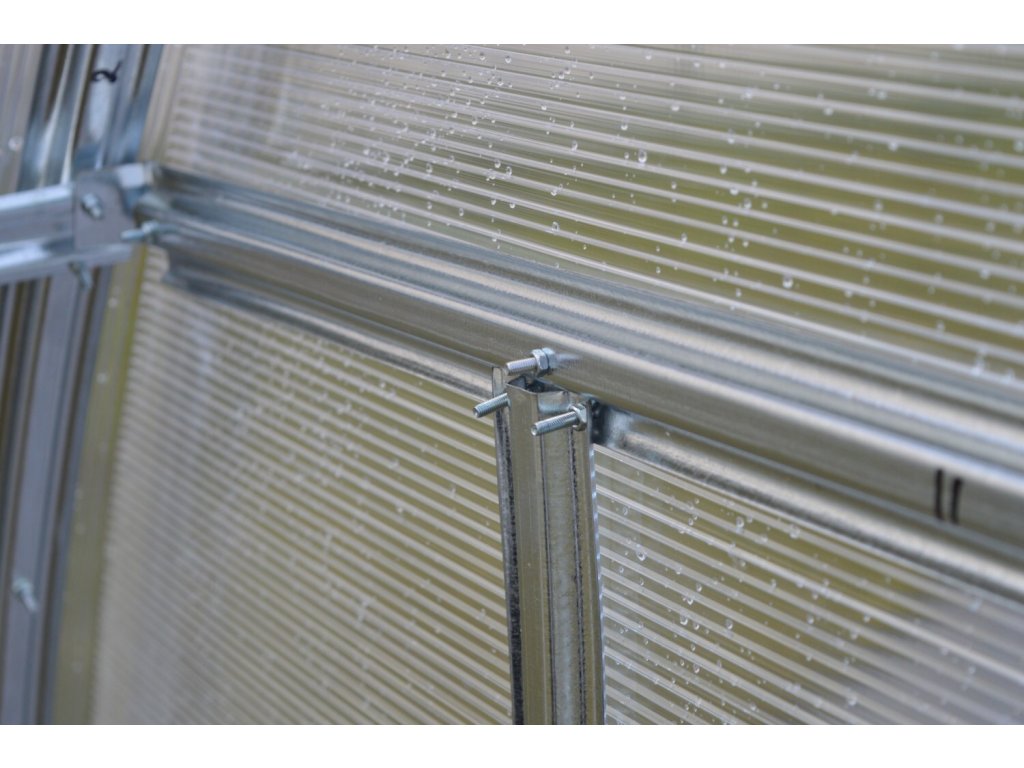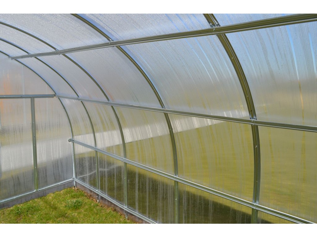 Zasklení skleníku je tvořeno čirým komůrkovým polykarbonátem o tloušťce 4 mm britské výroby MARLON LONGLIFE (výrobce Brett Martin - Velká Británie). Polykarbonát má silný UV filtr, takže nekřehne ani nežloutne. Polykarbonát splňuje veškeré podmínky pro udělení atestace zdravotní nezávadnosti toxikologickým centrem vydaným státním zdravotním ústavem. Můžete si tak nerušeně pěstovat zeleninu bez obav o své zdraví. Smluvní prodloužená záruka 10 let na nerozbitnost krupobitím.