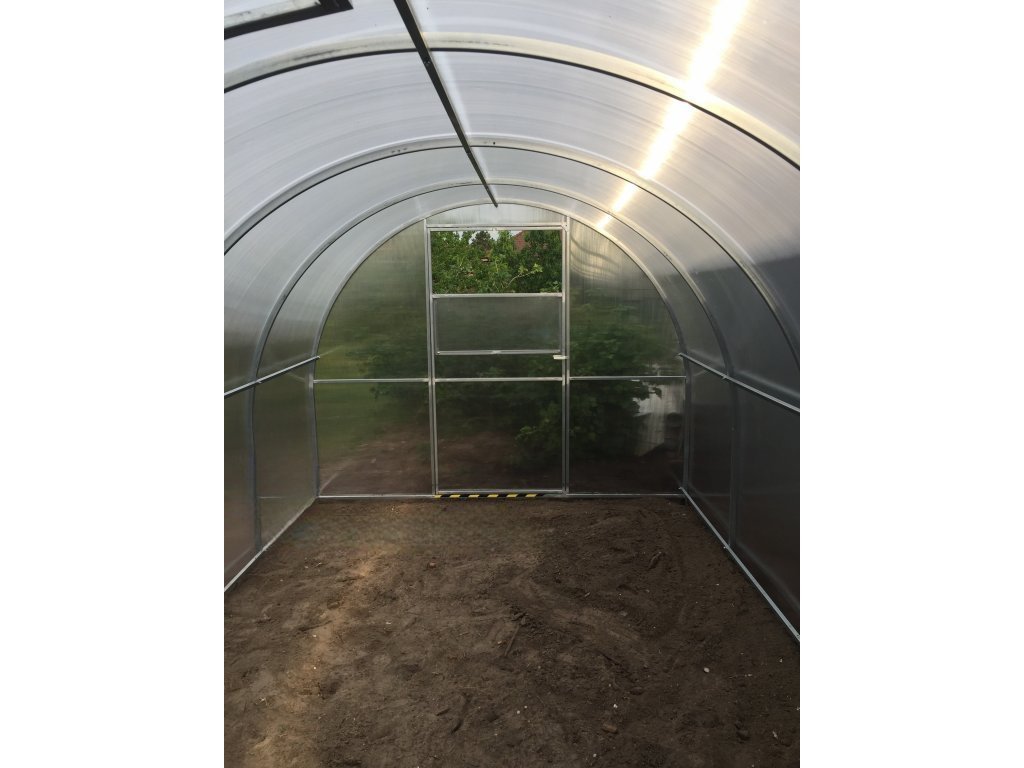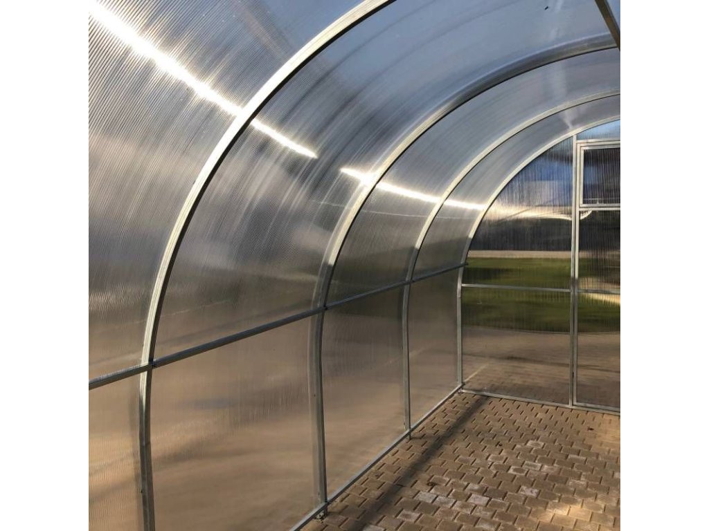 Zasklení skleníku je tvořeno čirým dutinkovým (komůrkovým) polykarbonátem o tloušťce 4 mm s UV ochranou, která zamezuje křehnutí materiálu a změně barvy. Polykarbonát je samozřejmě certifikovaný a splňuje veškeré podmínky zdravotní nezávadnosti.