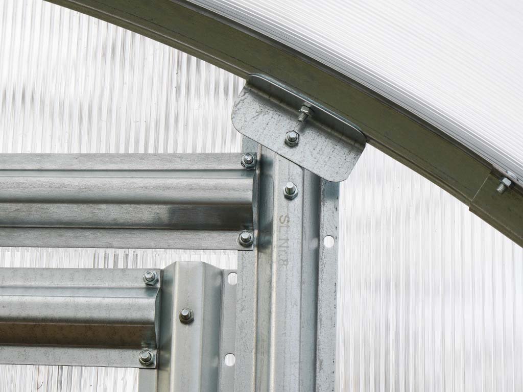 Zahradní skleník z polykarbonátu LEGI Mint je novým přírůstkem mezi oblíbené obloukové skleníky. Konstrukce skleníku je vyrobena z žárově pozinkovaných profilů o síle 1 mm a splňuje obzvláště vysoké požadavky na kvalitu a odolnost. Opláštění skleníku je tvořeno 6 mm vysokogramážním dutinkovým polykarbonátem s jednostrannou UV ochranou, který má zvýšené tepelně izolační vlastnosti.