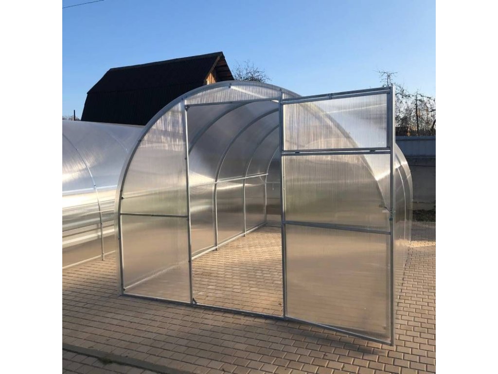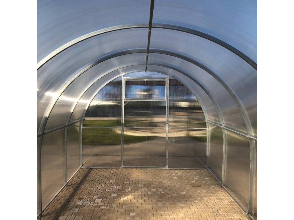 Zasklení skleníku je tvořeno čirým dutinkovým (komůrkovým) polykarbonátem o tloušťce 6 mm s UV ochranou, která zamezuje křehnutí materiálu a změně barvy. Polykarbonát je samozřejmě certifikovaný a splňuje veškeré podmínky zdravotní nezávadnosti.
