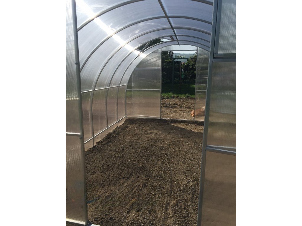 Zasklení skleníku je tvořeno čirým dutinkovým (komůrkovým) polykarbonátem o tloušťce 4 mm s UV ochranou, která zamezuje křehnutí materiálu a změně barvy. Polykarbonát je samozřejmě certifikovaný a splňuje veškeré podmínky zdravotní nezávadnosti.