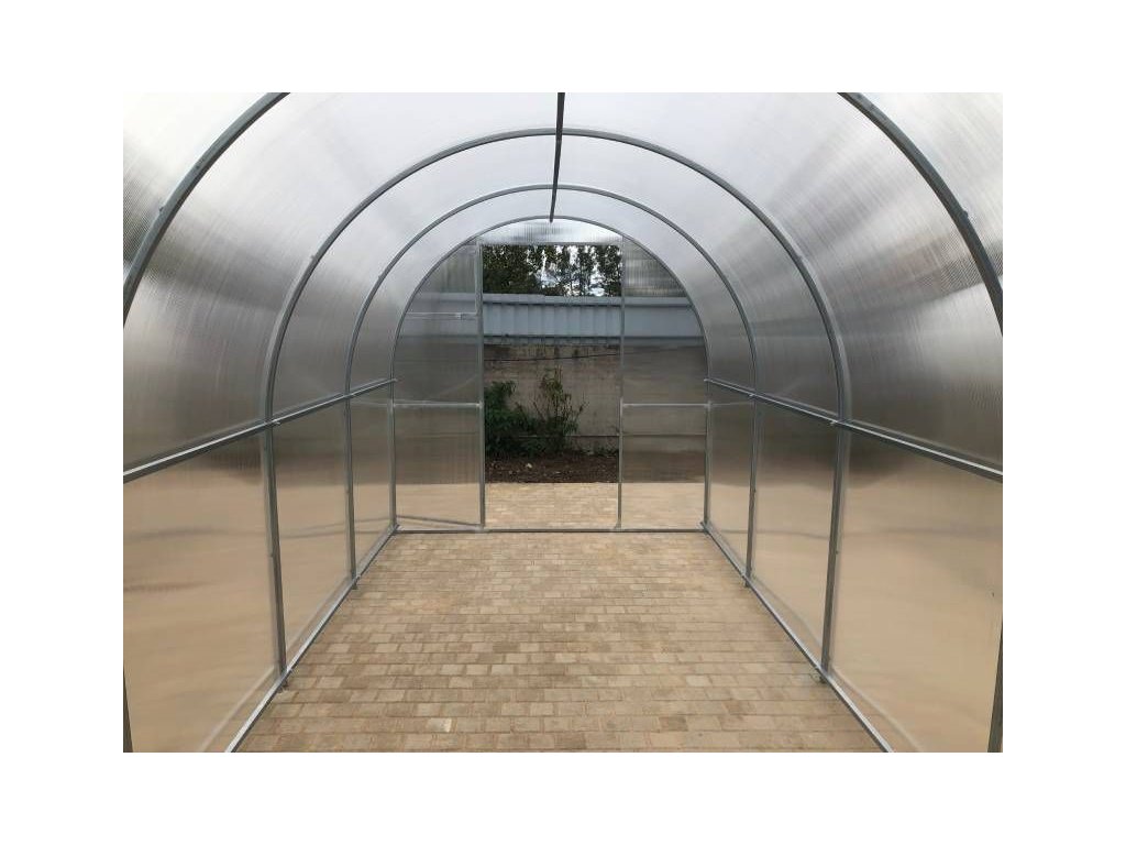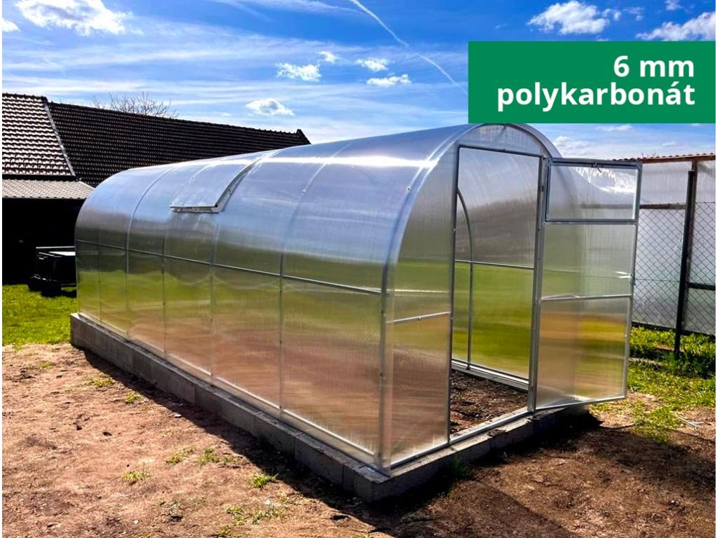 Zasklení skleníku je tvořeno čirým dutinkovým (komůrkovým) polykarbonátem o tloušťce 6 mm s UV ochranou, která zamezuje křehnutí materiálu a změně barvy. Polykarbonát je samozřejmě certifikovaný a splňuje veškeré podmínky zdravotní nezávadnosti.