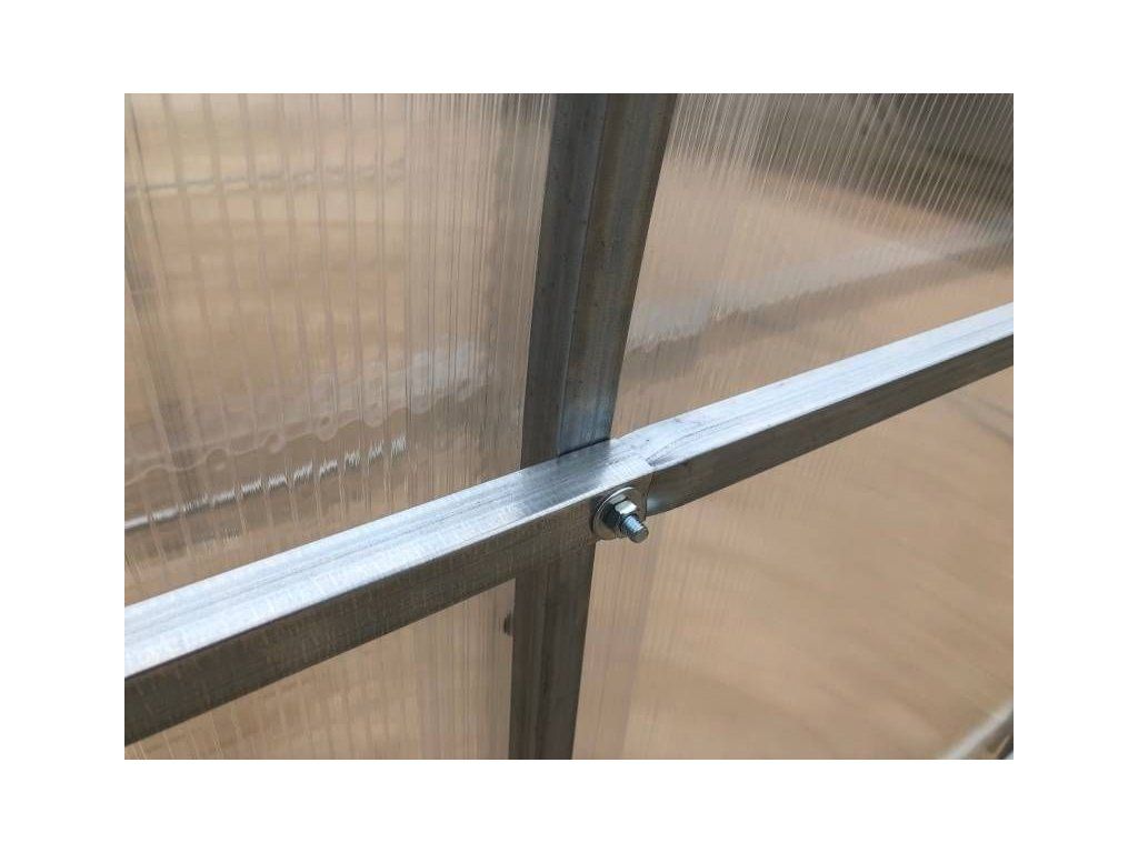 Zasklení skleníku je tvořeno čirým dutinkovým (komůrkovým) polykarbonátem o tloušťce 6 mm s UV ochranou, která zamezuje křehnutí materiálu a změně barvy. Polykarbonát je samozřejmě certifikovaný a splňuje veškeré podmínky zdravotní nezávadnosti.