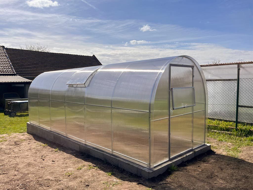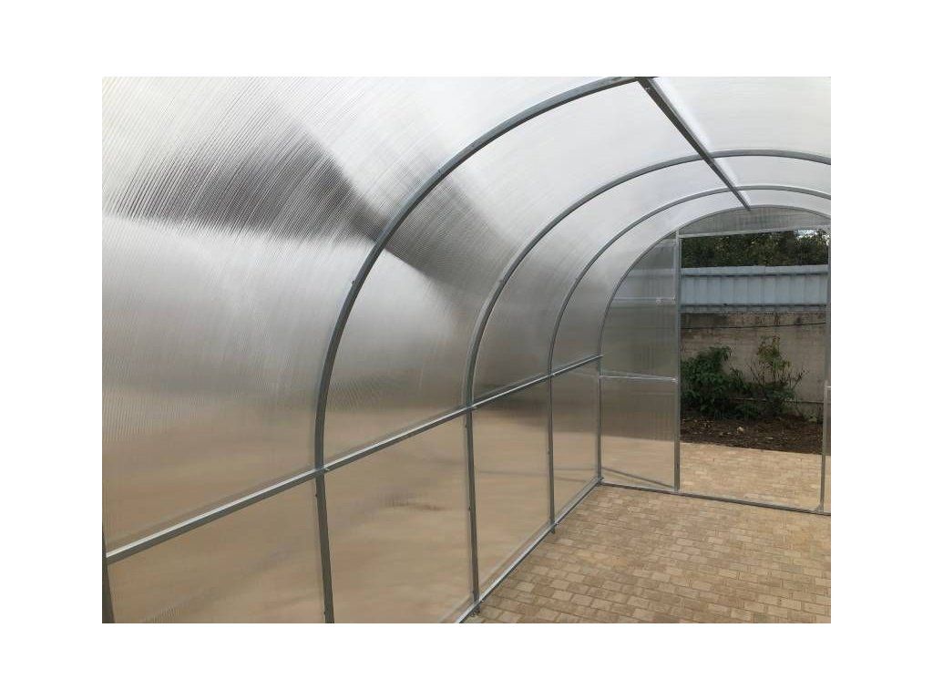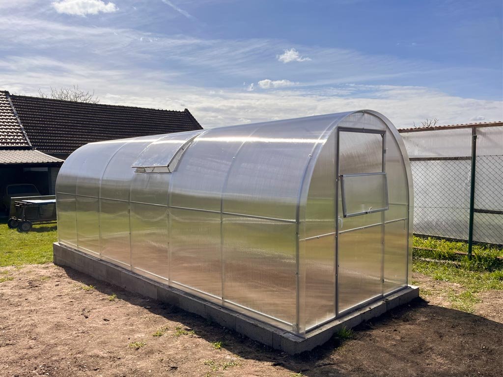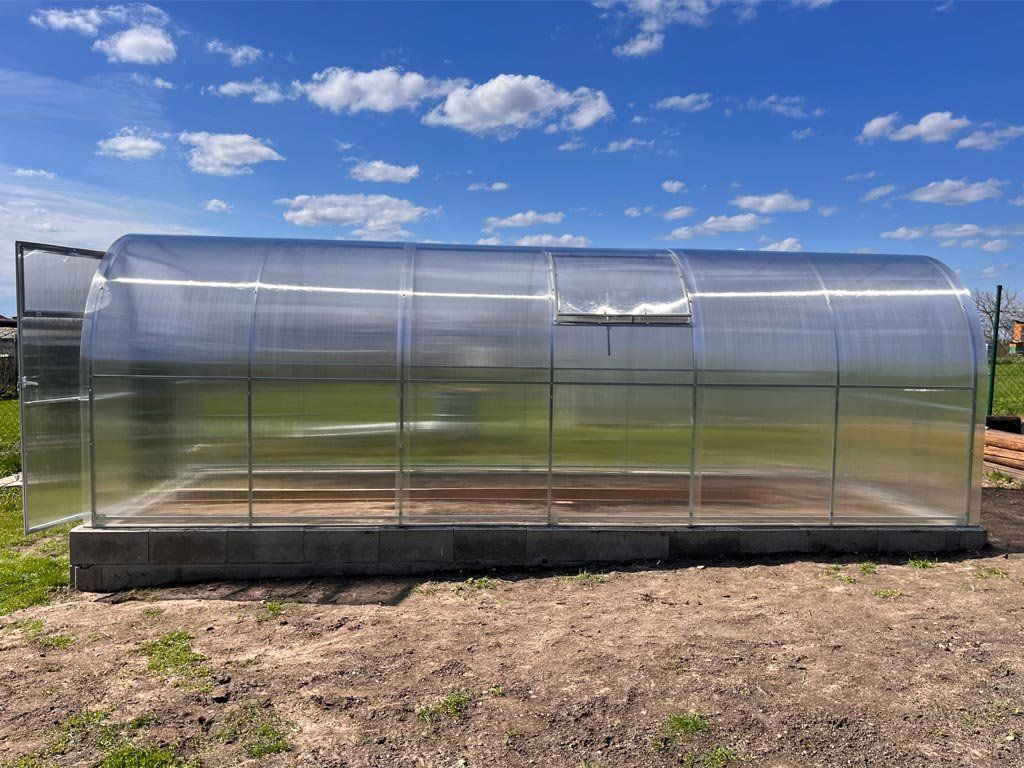 Zasklení skleníku je tvořeno čirým dutinkovým (komůrkovým) polykarbonátem o tloušťce 6 mm s UV ochranou, která zamezuje křehnutí materiálu a změně barvy. Polykarbonát je samozřejmě certifikovaný a splňuje veškeré podmínky zdravotní nezávadnosti.