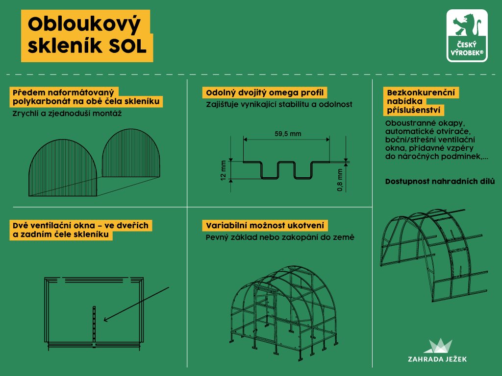 Konstrukce obloukového skleníku Limes SOL je tvořena žárově zinkovanými ocelovými omega profily o rozměrech 59,5 x 12 mm. Silná pozinkovaná úprava chrání skleník proti korozi, přičemž pozinkovaná je jak vnější, tak vnitřní strana profilu. Konstrukce je vyrobena z plechů o síle 0,8 až 1,5 mm, přičemž vysoká tuhost profilu je zajištěna strojním válcováním (dvojitý omega profil).