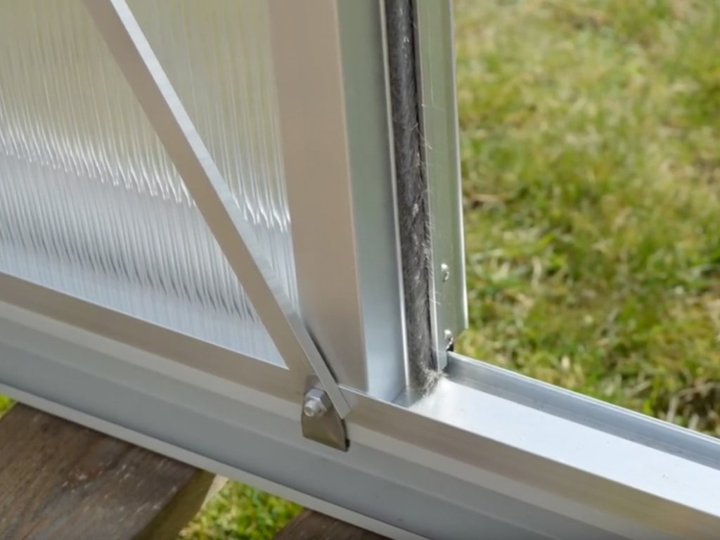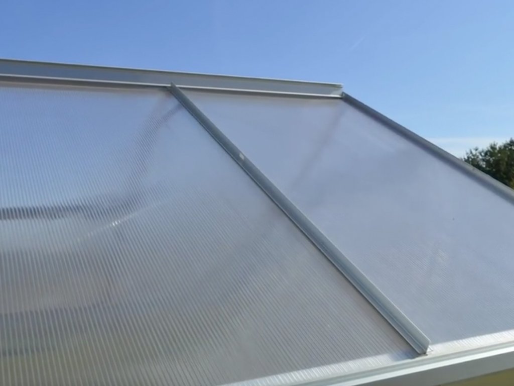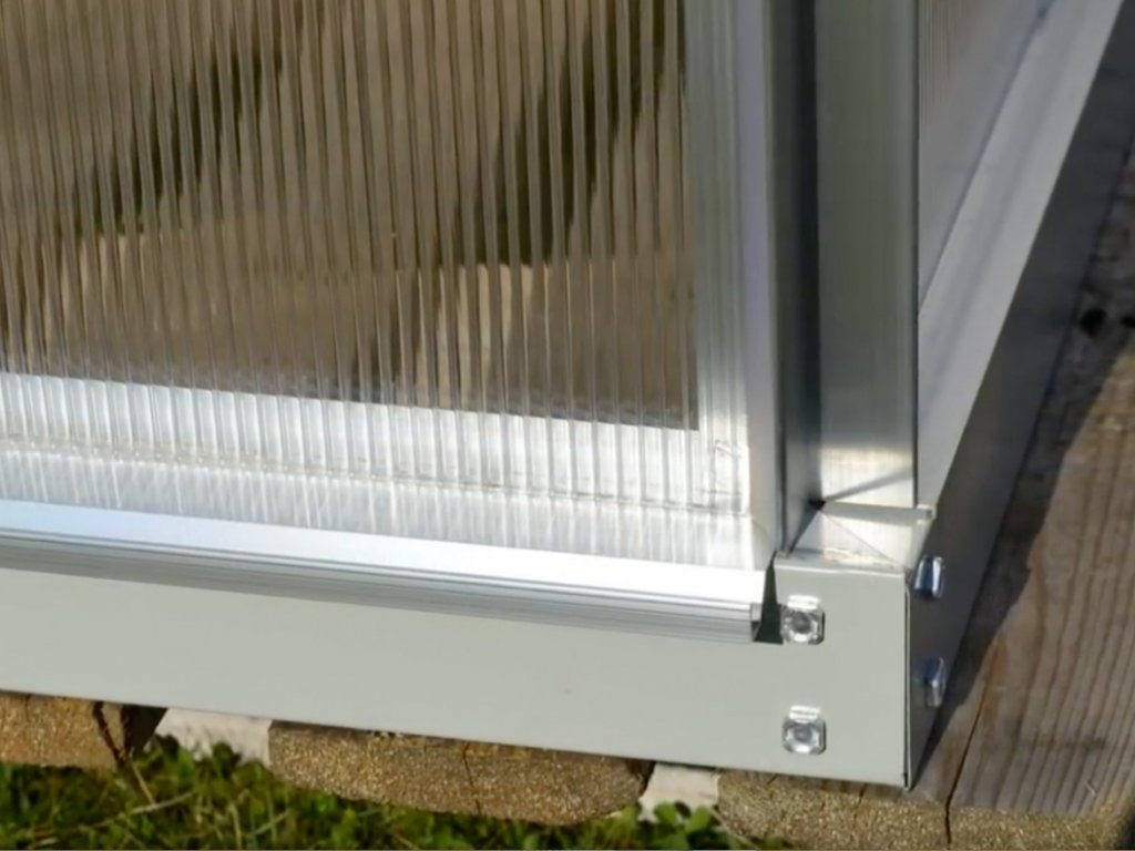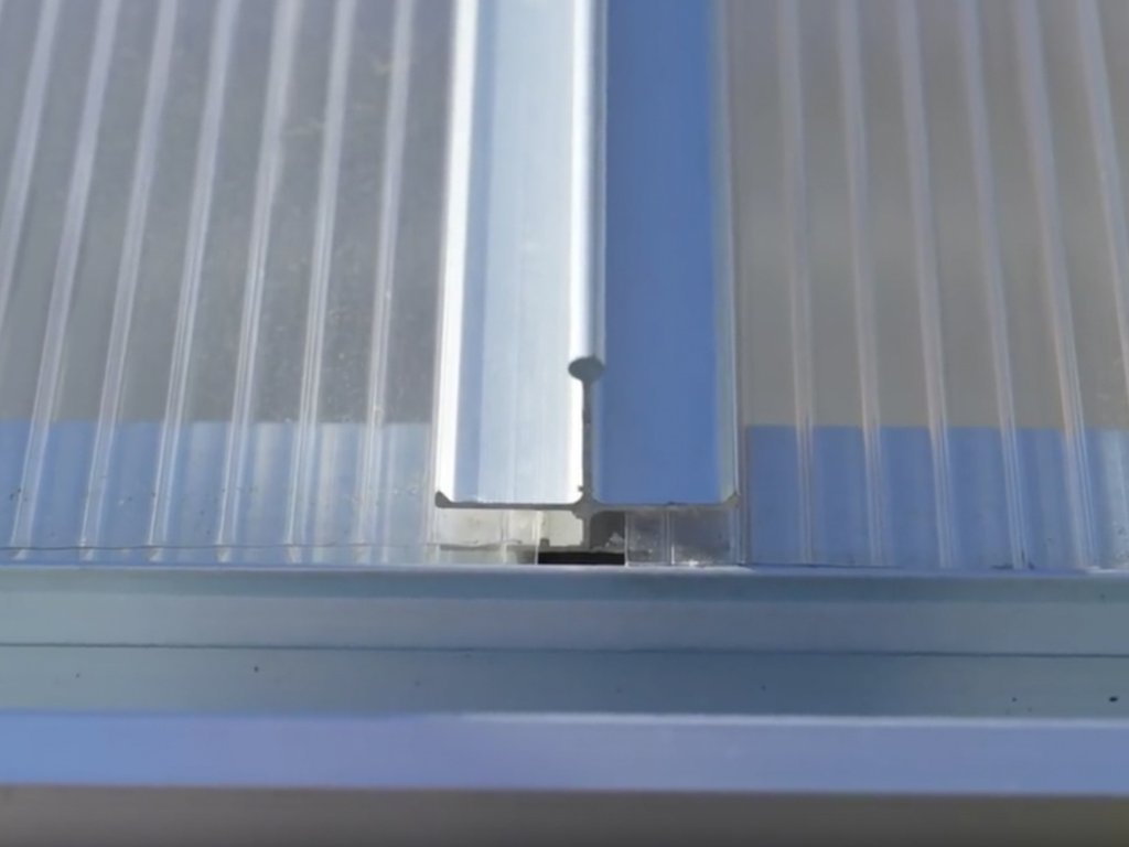 Polykarbonát je zasunut do hliníkových H-profilů po obvodě, s výjimkou krajních polí a čela skleníku, kde je prosklení zajištěno pevnou polykarbonátovou lištou. Jedná se o velmi kvalitní řešení, které významně zvýšilo celkovou pevnost a stabilitu celého skleníku vůči větru a sněhovému zatížení.