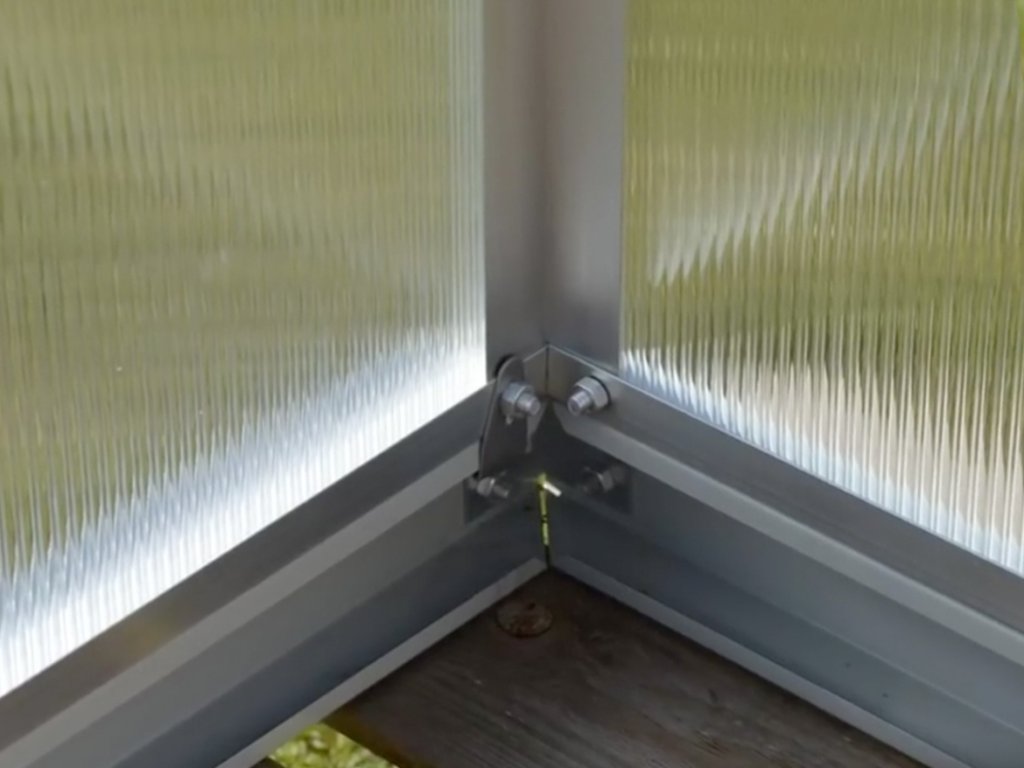 Polykarbonát je zasunut do hliníkových H-profilů po obvodě, s výjimkou krajních polí a čela skleníku, kde je prosklení zajištěno pevnou polykarbonátovou lištou. Jedná se o velmi kvalitní řešení, které významně zvýšilo celkovou pevnost a stabilitu celého skleníku vůči větru a sněhovému zatížení.