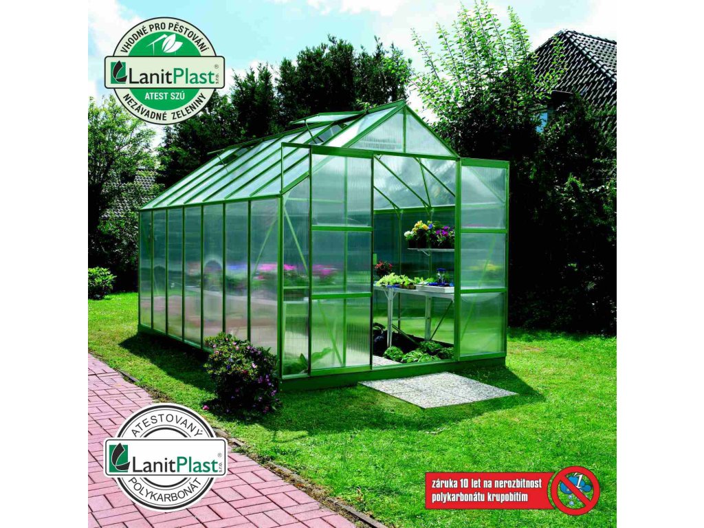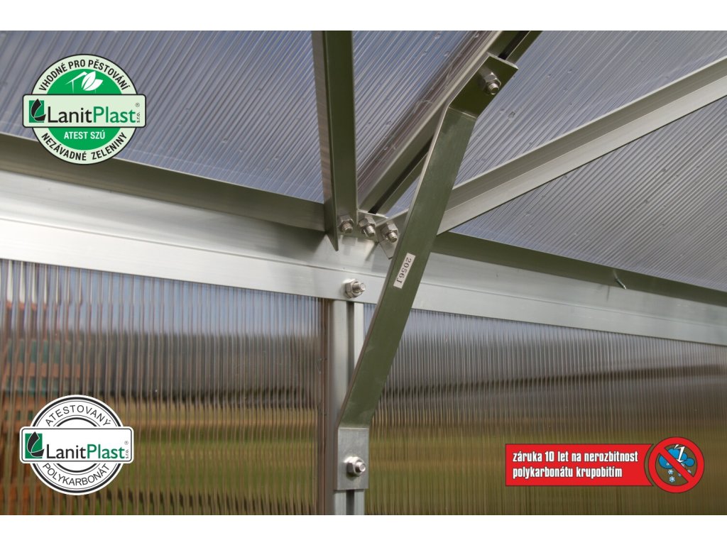 Konstrukce skleníku je vyrobena z kvalitních eloxovaných hliníkových profilů 1,2 mm, kdy výrobce poskytuje smluvní záruku 15 let na AL konstrukci. Zasklení skleníku je tvořeno velmi kvalitním dvoustěnným komůrkovým polykarbonátem o tloušťce 6 mm MARLON LONGLIFE (výrobce Brett Martin - Velká Británie), nebo SUNLITE (výrobce Palram Německo). Polykarbonát má silný UV filtr, takže nekřehne ani nežloutne. Světelná propustnost desek je cca 80 %, což plně dostačuje pro pěstování květin a zeleniny. Polykarbonát splňuje veškeré podmínky pro udělení atestace zdravotní nezávadnosti toxikologickým centrem vydaným státním zdravotním ústavem. Můžete si tak nerušeně pěstovat zeleninu bez obav o své zdraví. Smluvní prodloužená záruka 10 let na nerozbitnost krupobitím je u LANIT PLASTU samozřejmostí. Prosklení je do hliníkových profilů kotveno pomocí ocelových sponek. Pokud by vás tento skleník zaujal, ale spíše byste uvítali skleněné výplně, podívejte se na varianty se sklem.