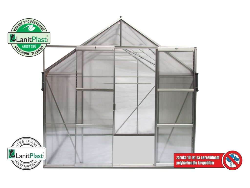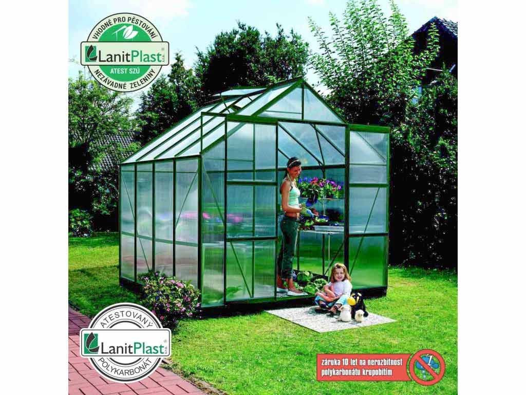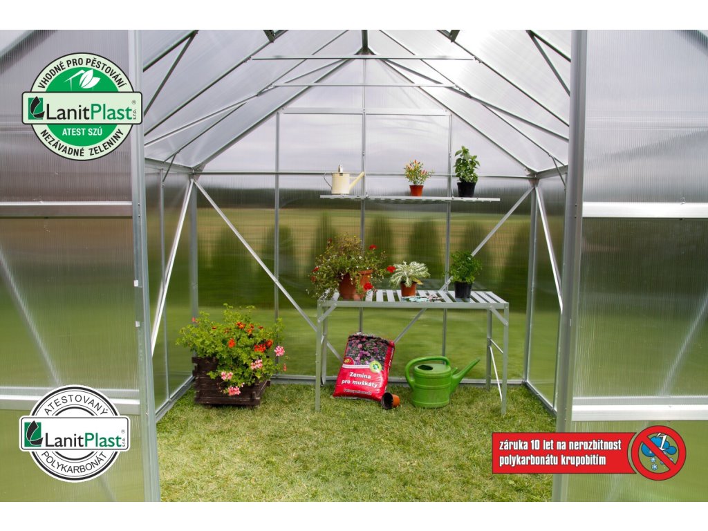 Konstrukce skleníku je vyrobena z kvalitních eloxovaných hliníkových profilů 1,2 mm, kdy výrobce poskytuje smluvní záruku 15 let na AL konstrukci. Zasklení skleníku je tvořeno velmi kvalitním dvoustěnným komůrkovým polykarbonátem o tloušťce 4 mm MARLON LONGLIFE (výrobce Brett Martin - Velká Británie), nebo SUNLITE (výrobce Palram Německo). Polykarbonát má silný UV filtr, takže nekřehne ani nežloutne. Světelná propustnost desek je cca 80 %, což plně dostačuje pro pěstování květin a zeleniny. Polykarbonát splňuje veškeré podmínky pro udělení atestace zdravotní nezávadnosti toxikologickým centrem vydaným státním zdravotním ústavem. Můžete si tak nerušeně pěstovat zeleninu bez obav o své zdraví. Smluvní prodloužená záruka 10 let na nerozbitnost krupobitím je u LANIT PLASTU samozřejmostí. Prosklení je do hliníkových profilů kotveno pomocí ocelových sponek. Pokud by vás tento skleník zaujal, ale spíše byste uvítali skleněné výplně, podívejte se na varianty se sklem zde.
