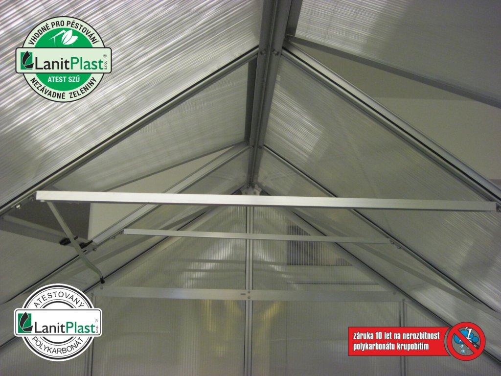 Konstrukce skleníku je vyrobena z kvalitních eloxovaných hliníkových profilů 1,2 mm, kdy výrobce poskytuje smluvní záruku 15 let na AL konstrukci. Zasklení skleníku je tvořeno velmi kvalitním dvoustěnným komůrkovým polykarbonátem o tloušťce 6 mm MARLON LONGLIFE (výrobce Brett Martin - Velká Británie), nebo SUNLITE (výrobce Palram Německo). Polykarbonát má silný UV filtr, takže nekřehne ani nežloutne. Světelná propustnost desek je cca 80 %, což plně dostačuje pro pěstování květin a zeleniny. Polykarbonát splňuje veškeré podmínky pro udělení atestace zdravotní nezávadnosti toxikologickým centrem vydaným státním zdravotním ústavem. Můžete si tak nerušeně pěstovat zeleninu bez obav o své zdraví. Smluvní prodloužená záruka 10 let na nerozbitnost krupobitím je u LANIT PLASTU samozřejmostí. Prosklení je do hliníkových profilů kotveno pomocí ocelových sponek. Pokud by vás tento skleník zaujal, ale spíše byste uvítali skleněné výplně, podívejte se na varianty se sklem.
