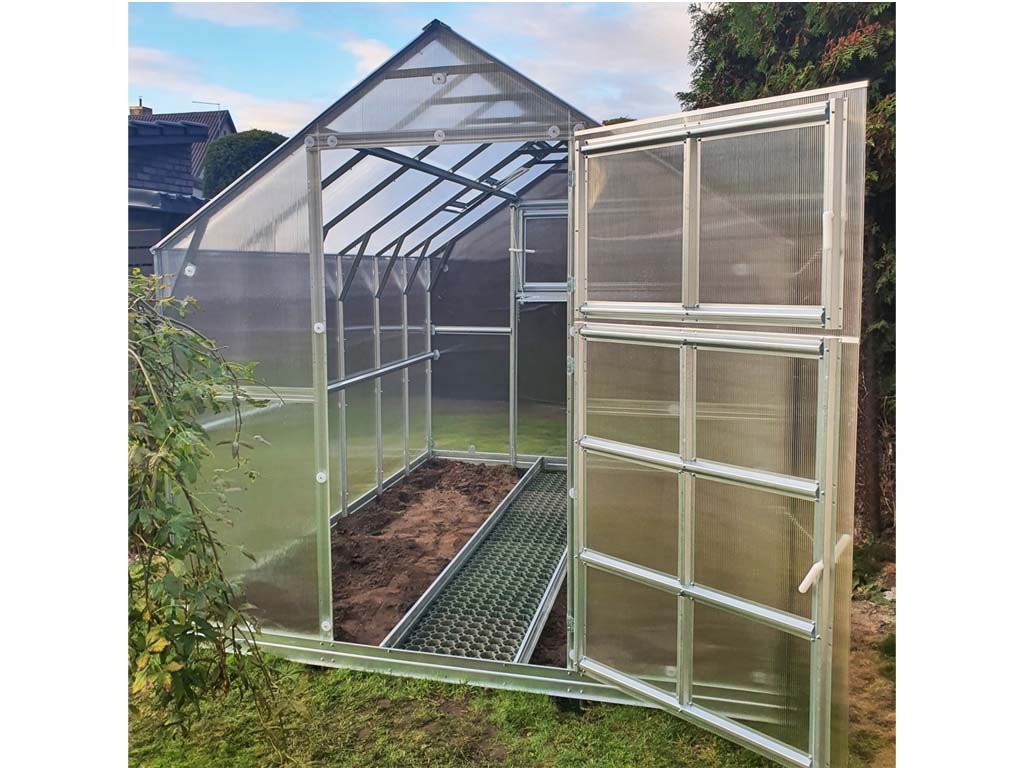 Zasklení skleníku je tvořeno čirým dutinkovým (komůrkovým) polykarbonátem o tloušťce 6 mm s UV ochranou, který má zvýšené tepelně izolační vlastnosti, oproti běžně prodávaným skleníkům. Polykarbonát splňuje veškeré podmínky zdravotní nezávadnosti. Polykarbonátové desky jsou již předem naformátovány.
