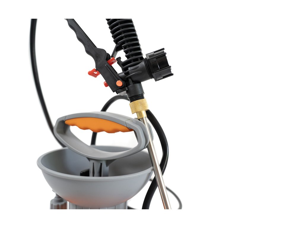 Tlakový postřikovač pracuje s maximálním tlakem 4 bary. Kontrolu hladiny 5 litrové nádrže vidíte na boční měrce. Kuželová
