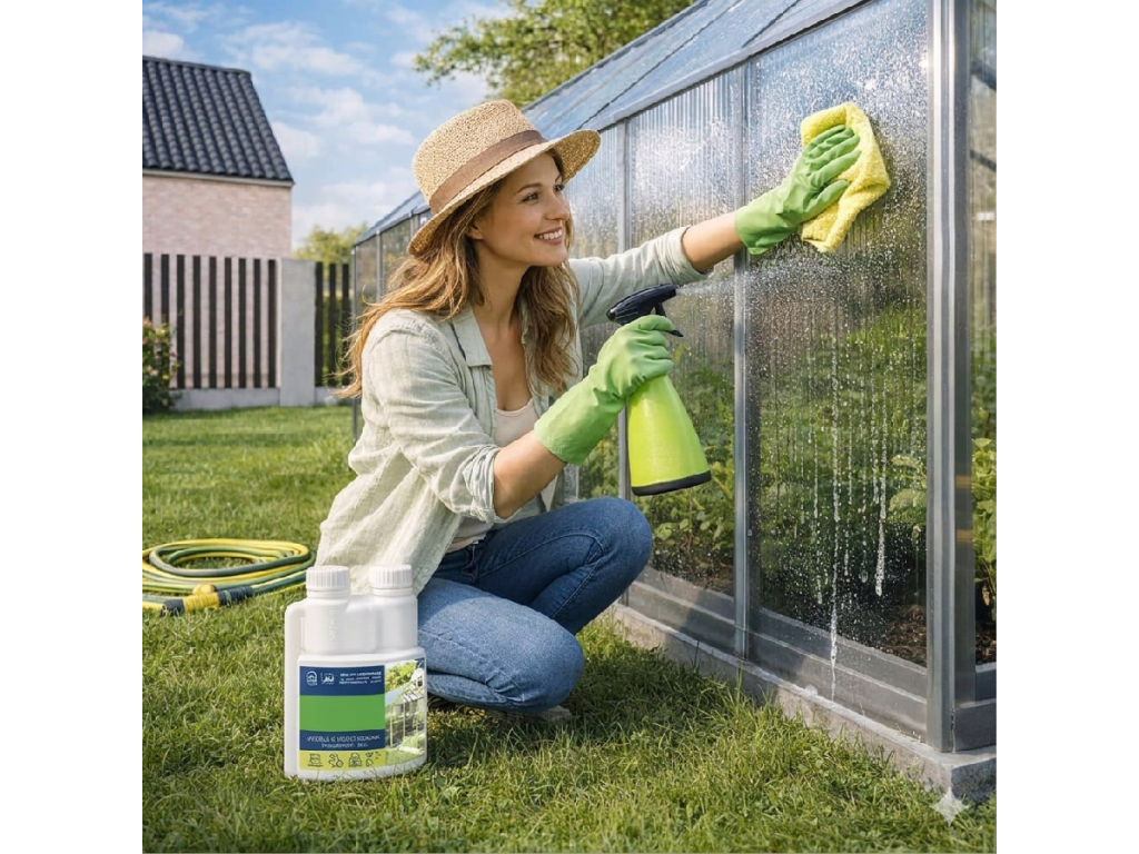 Hygienické řešení vyrobené v EU, speciálně navržené pro péči o váš skleník či pergolu. Tento koncentrovaný přípravek je vhodný pro polykarbonátové i skleněné výplně a také pro další povrchy skleníku. Lze jej bezpečně použít i na kovové konstrukce.